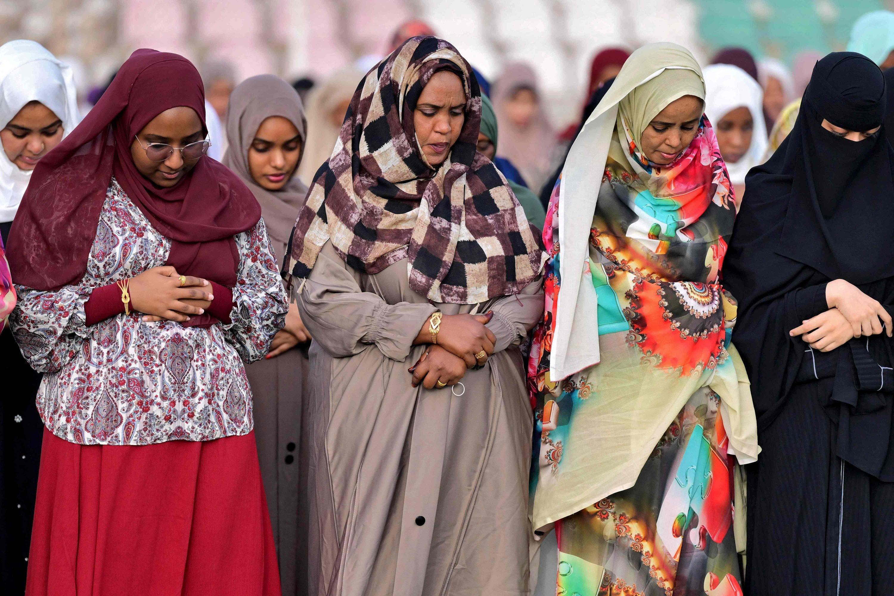 Women worshippers gather for Eid al-Fitr morning prayers at a stadium, Port Sudan, Sudan, March 20, 2026.