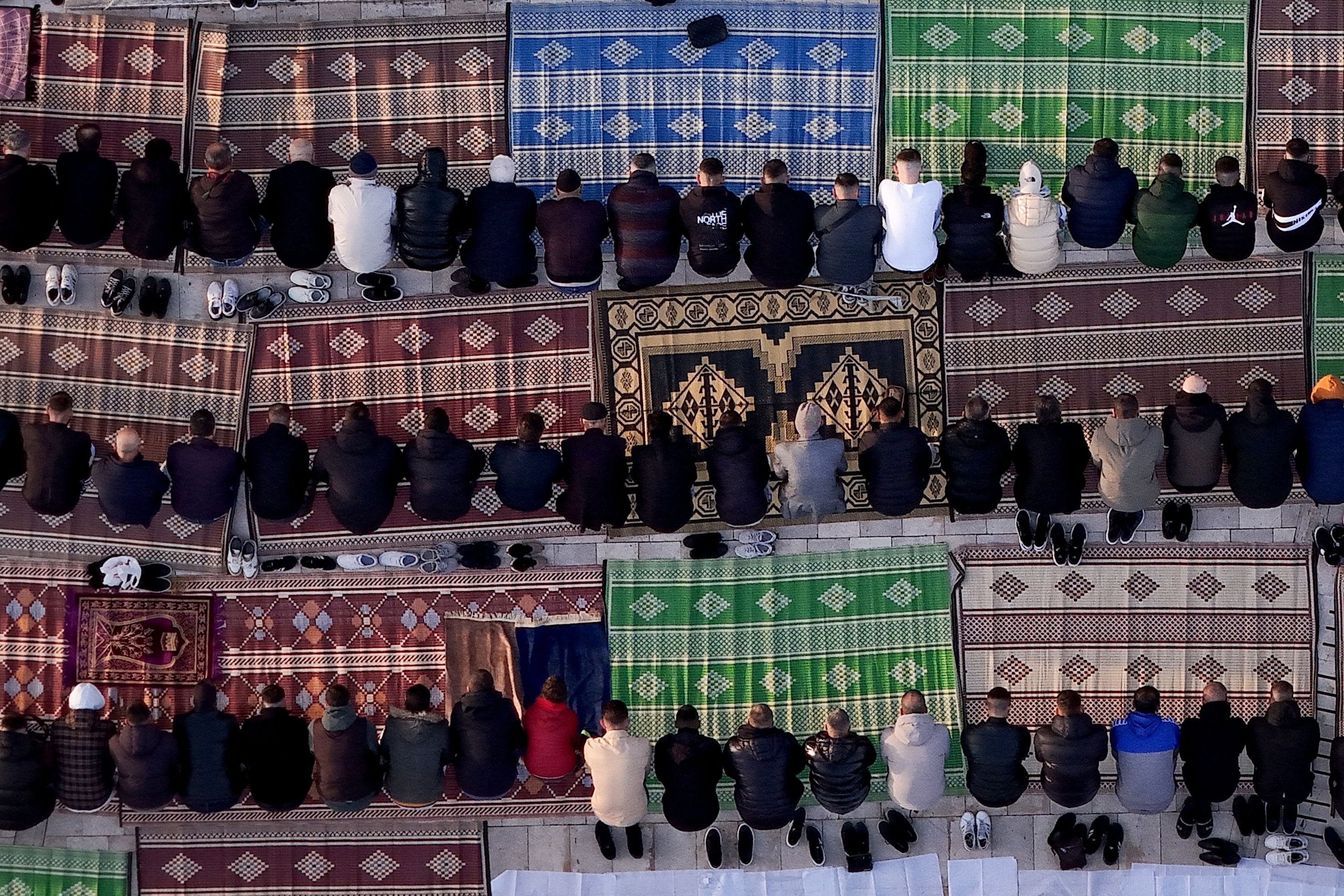 Aerial view of Albanian worshippers attending Eid morning prayers near the Grand Mosqu, Durres, Albania, March 20, 2026.