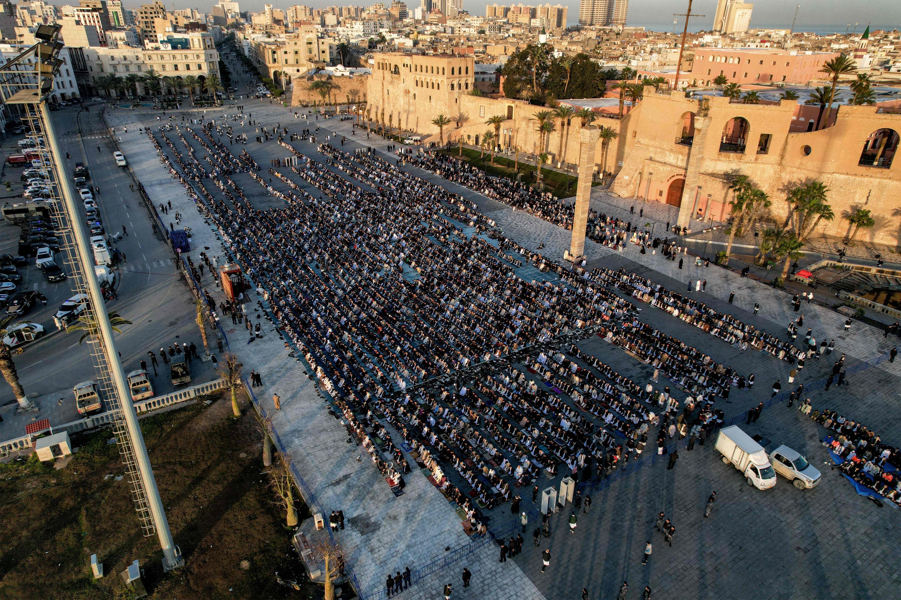 Huge crowds of Muslim worshippers gather for Eid al-Fitr morning prayers at Martyrs' Square, Tripoli, Libya, March 20, 2026.