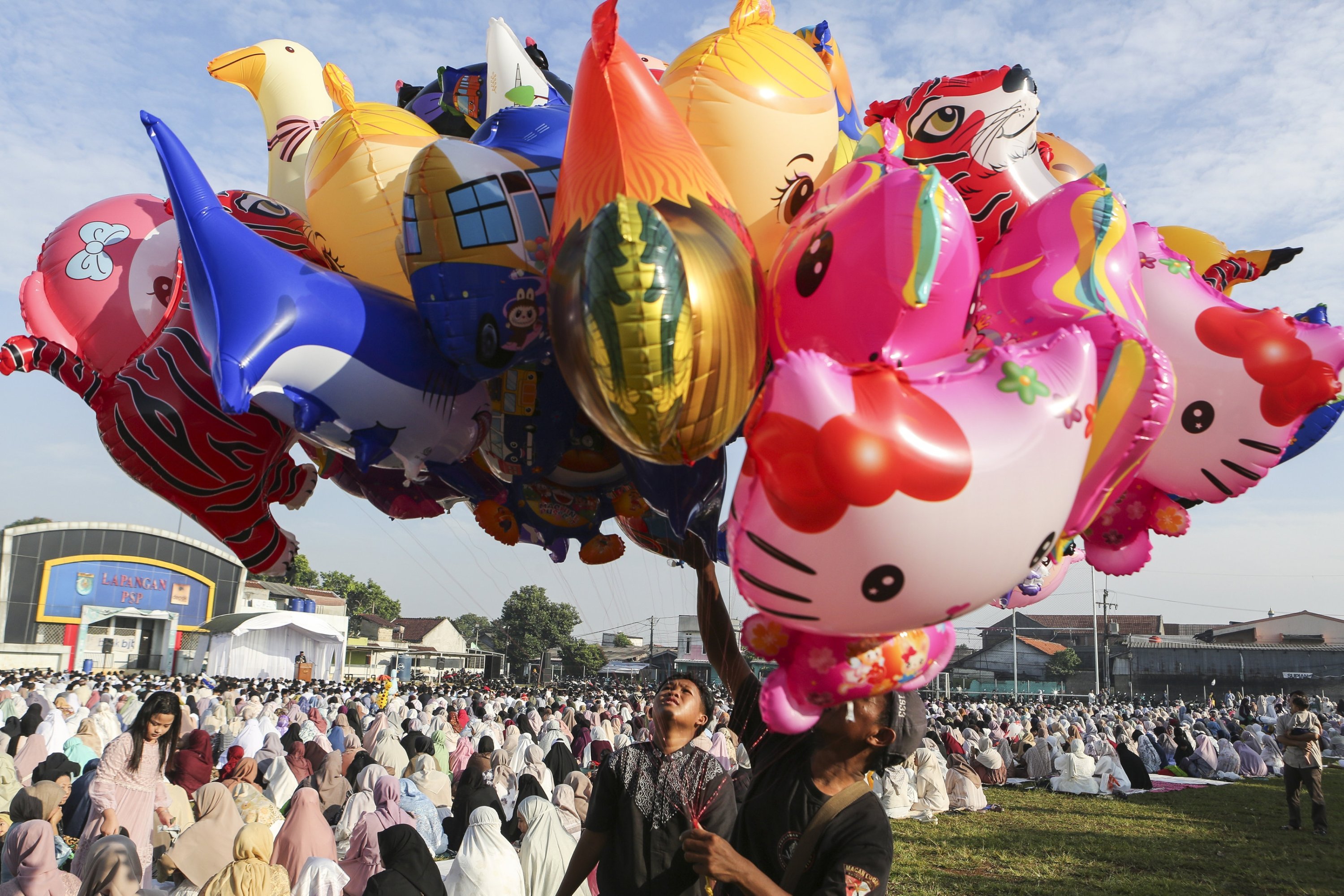 Man sells colorful balloons to children during Eid al-Fitr prayers, Depok, Indonesia, March 20, 2026.