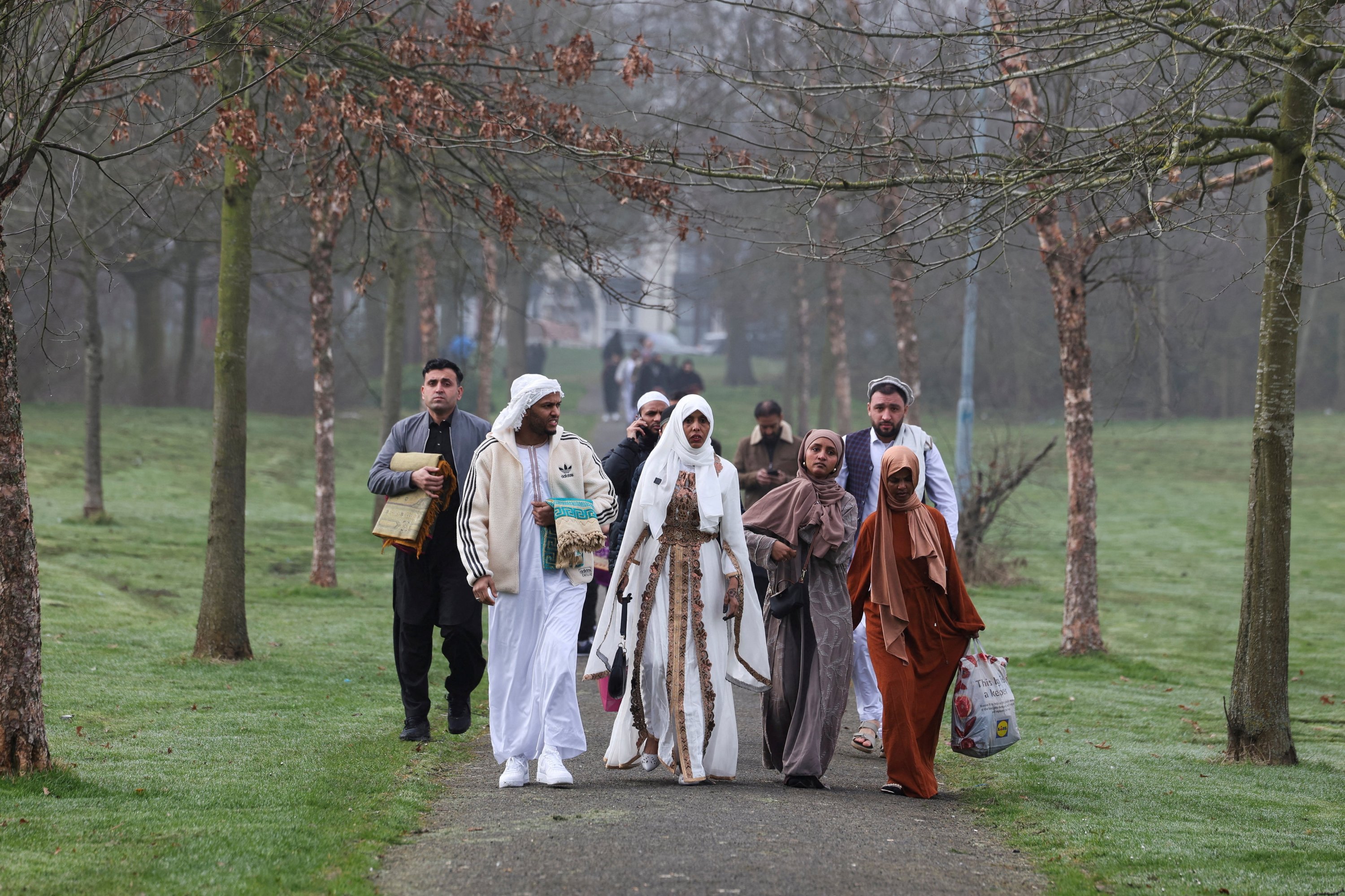 Groups of Muslim worshippers head to Small Heath Park for Eid prayers, Birmingham, U.K., March 20, 2026.