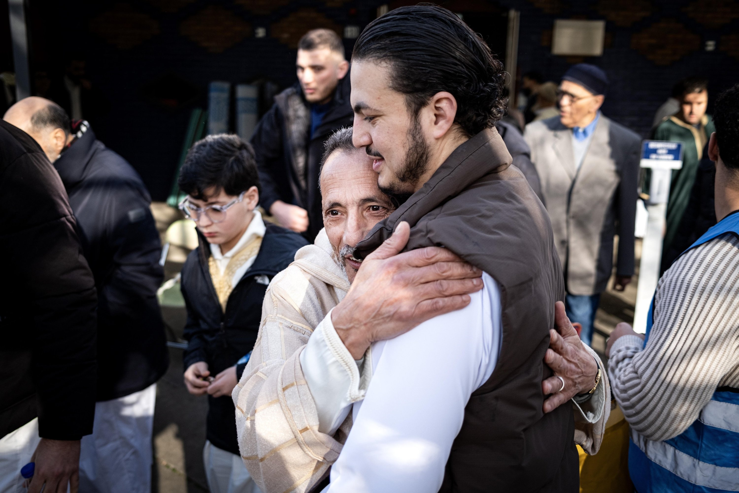 Men hug after Eid al-Fitr prayers at the Blue Mosque, Amsterdam, Netherlands, March 20, 2026.