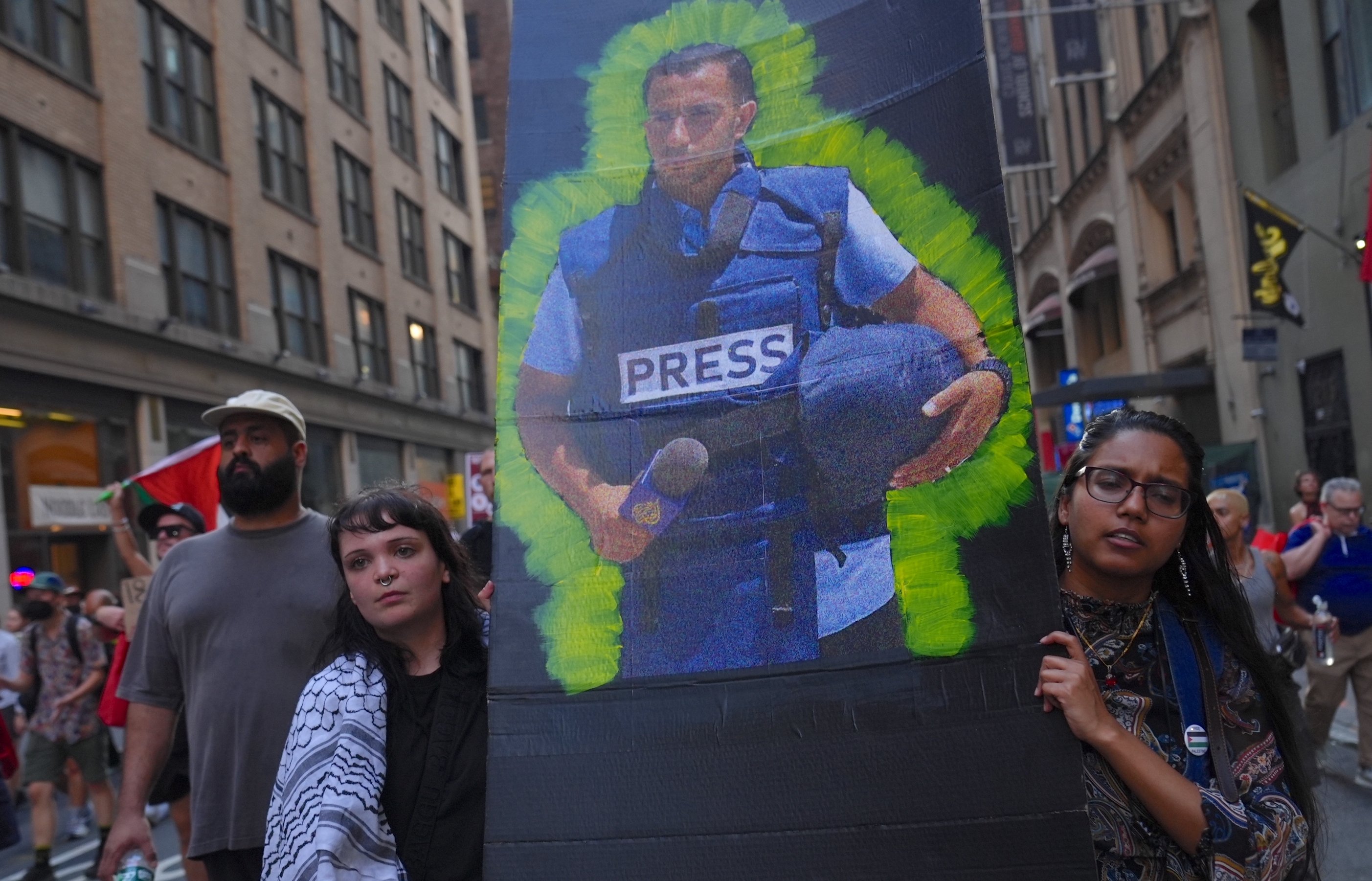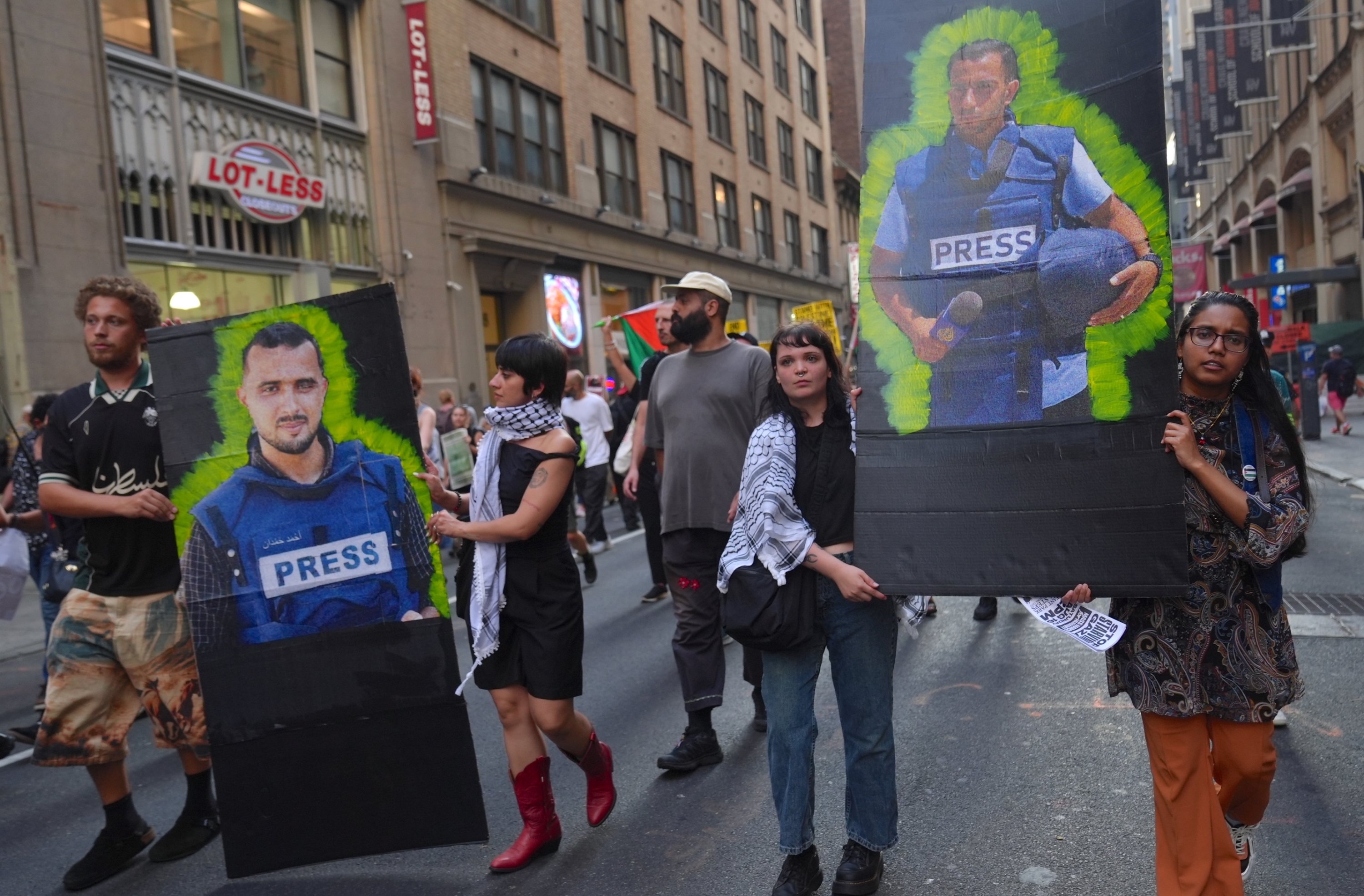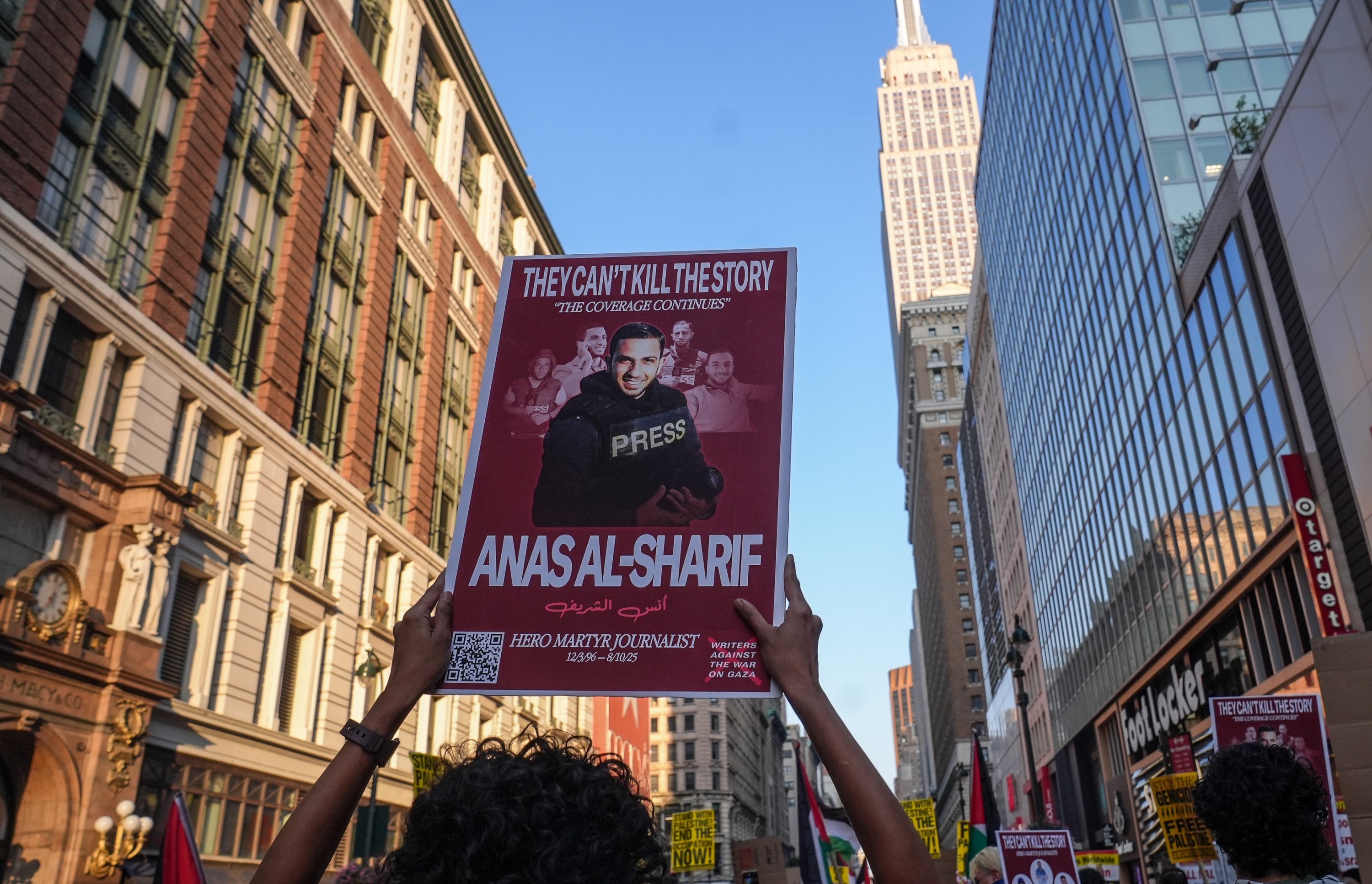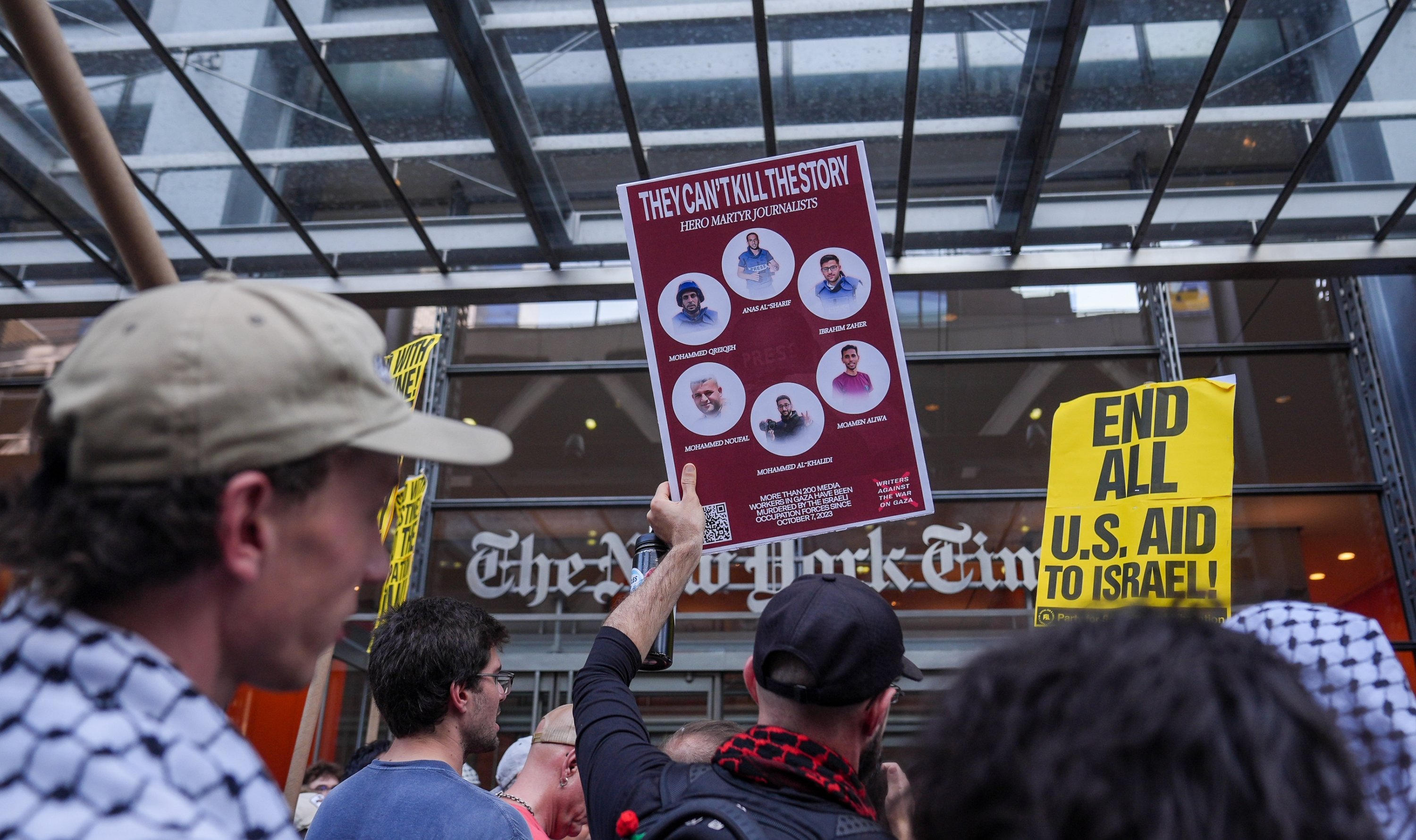 Demonstrators rallied outside The New York Times in New York City, accusing the paper of complicity in covering for Israel’s attacks on Gaza and protesting the killing of journalists in the enclave by Israeli forces.