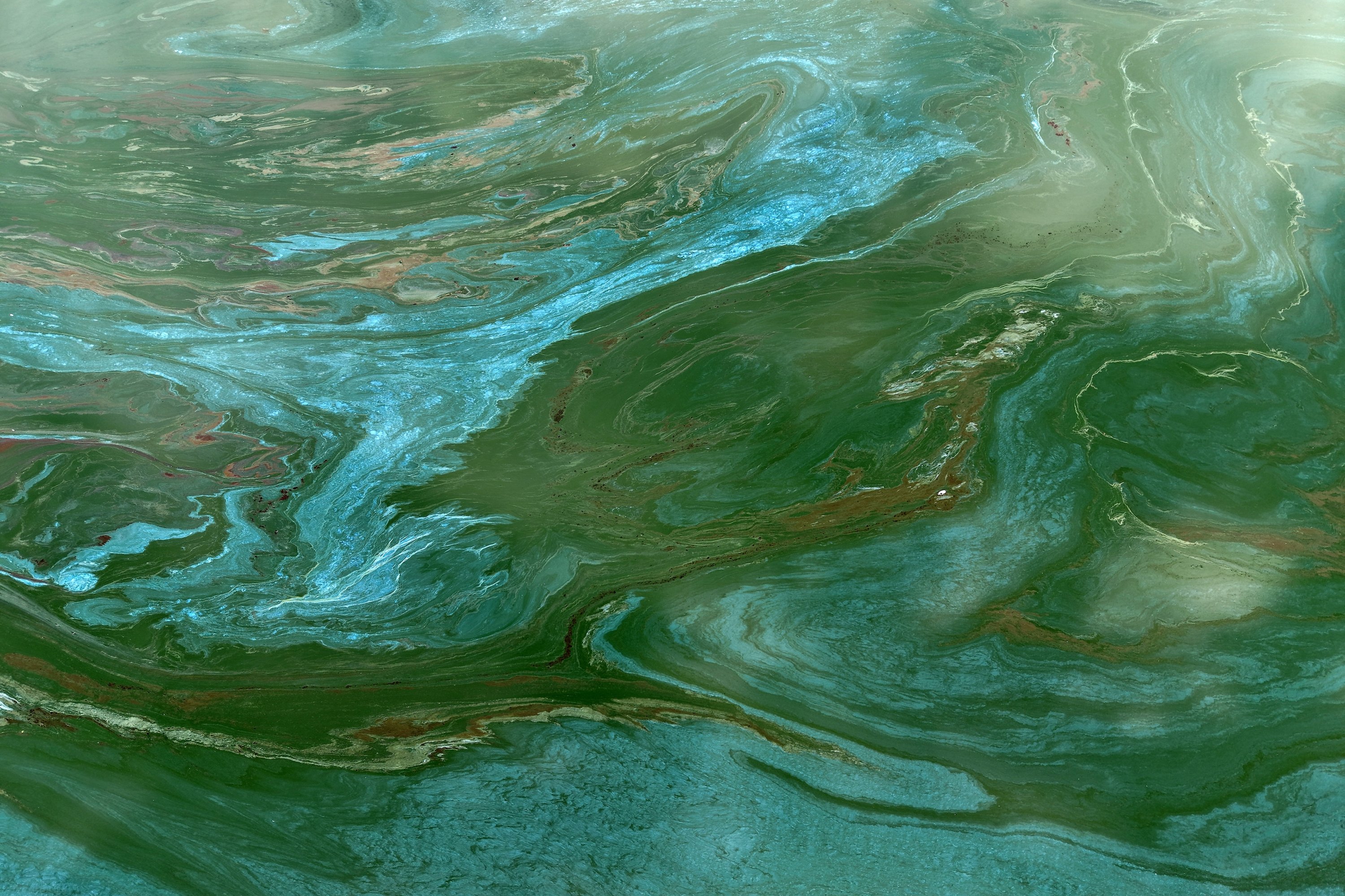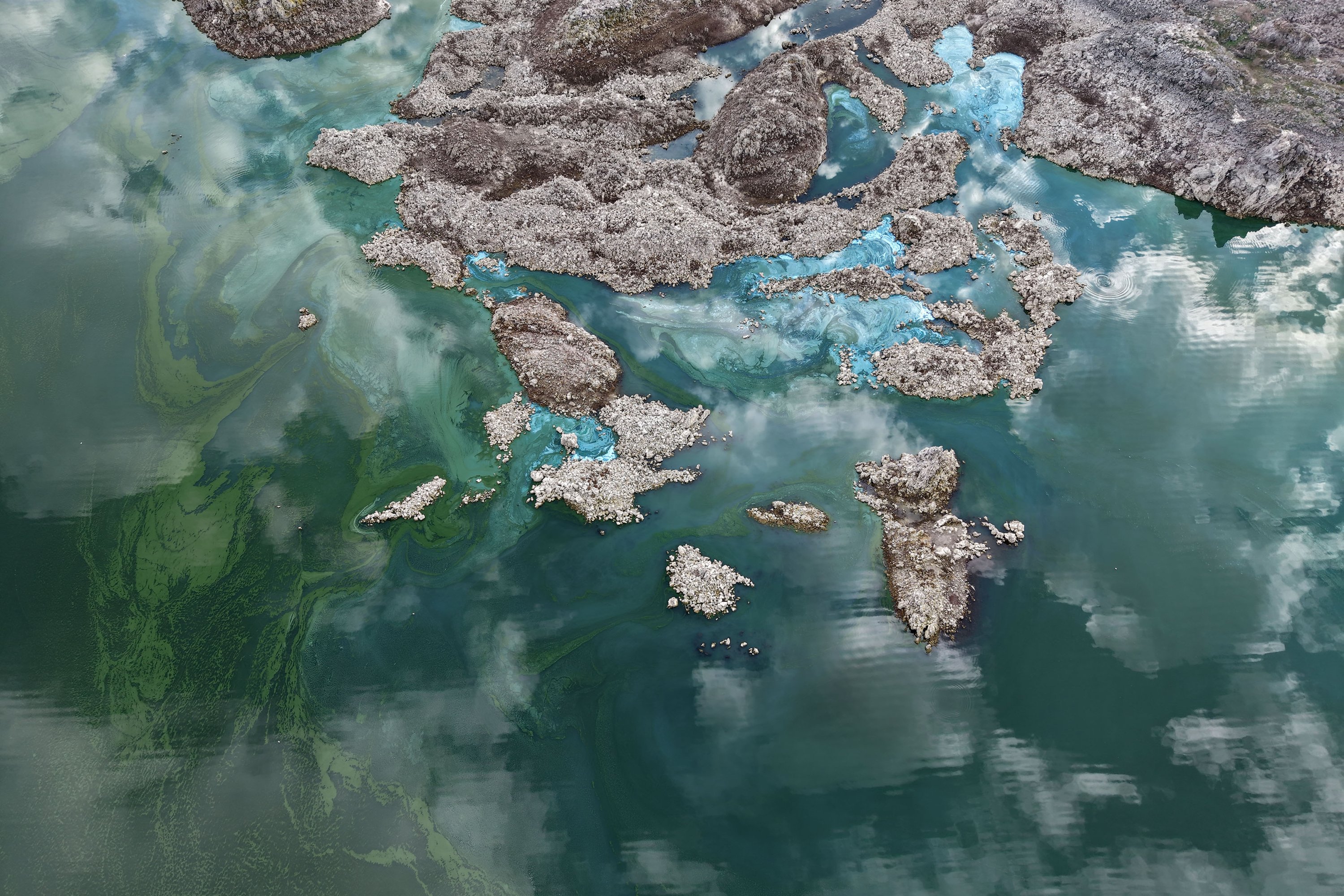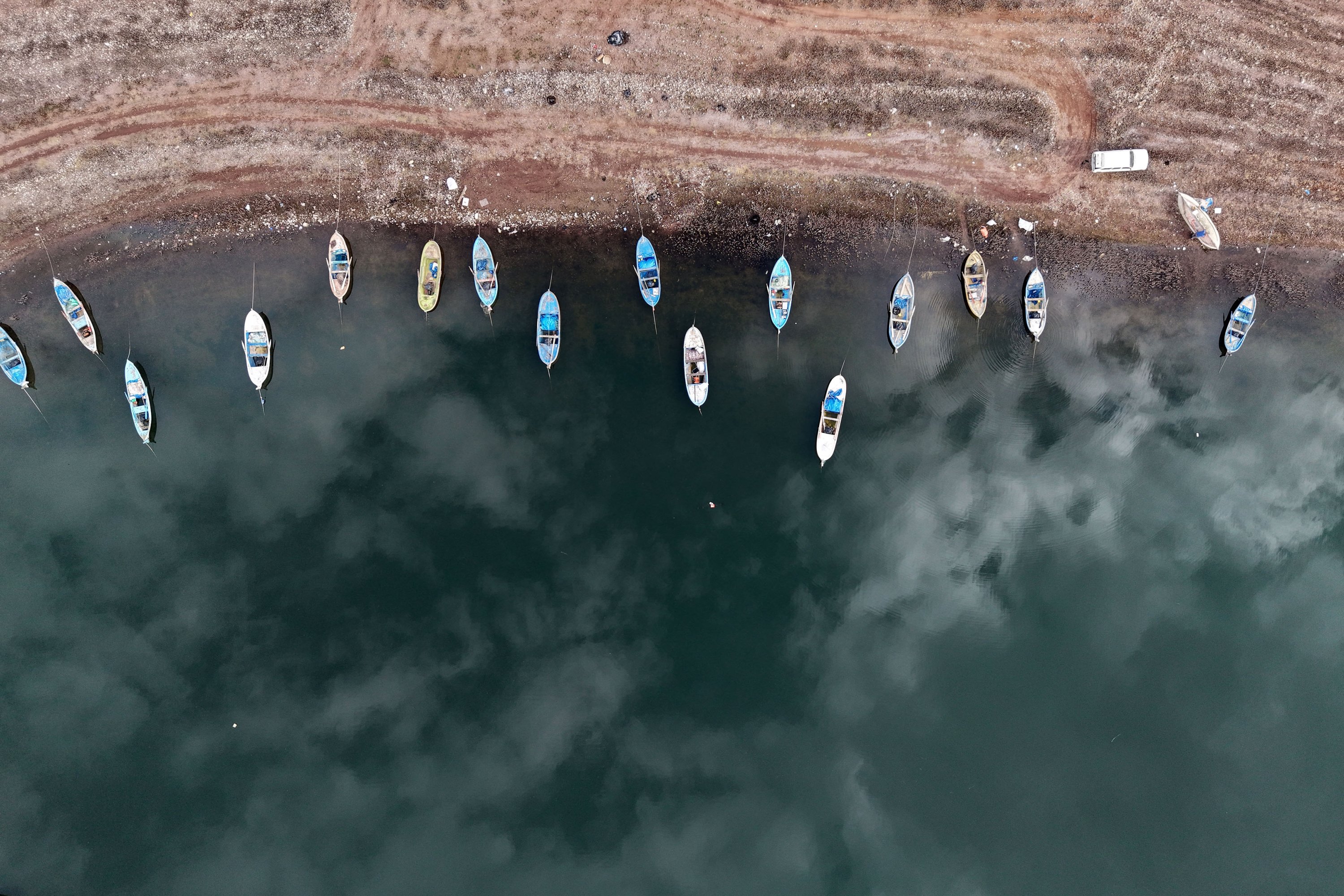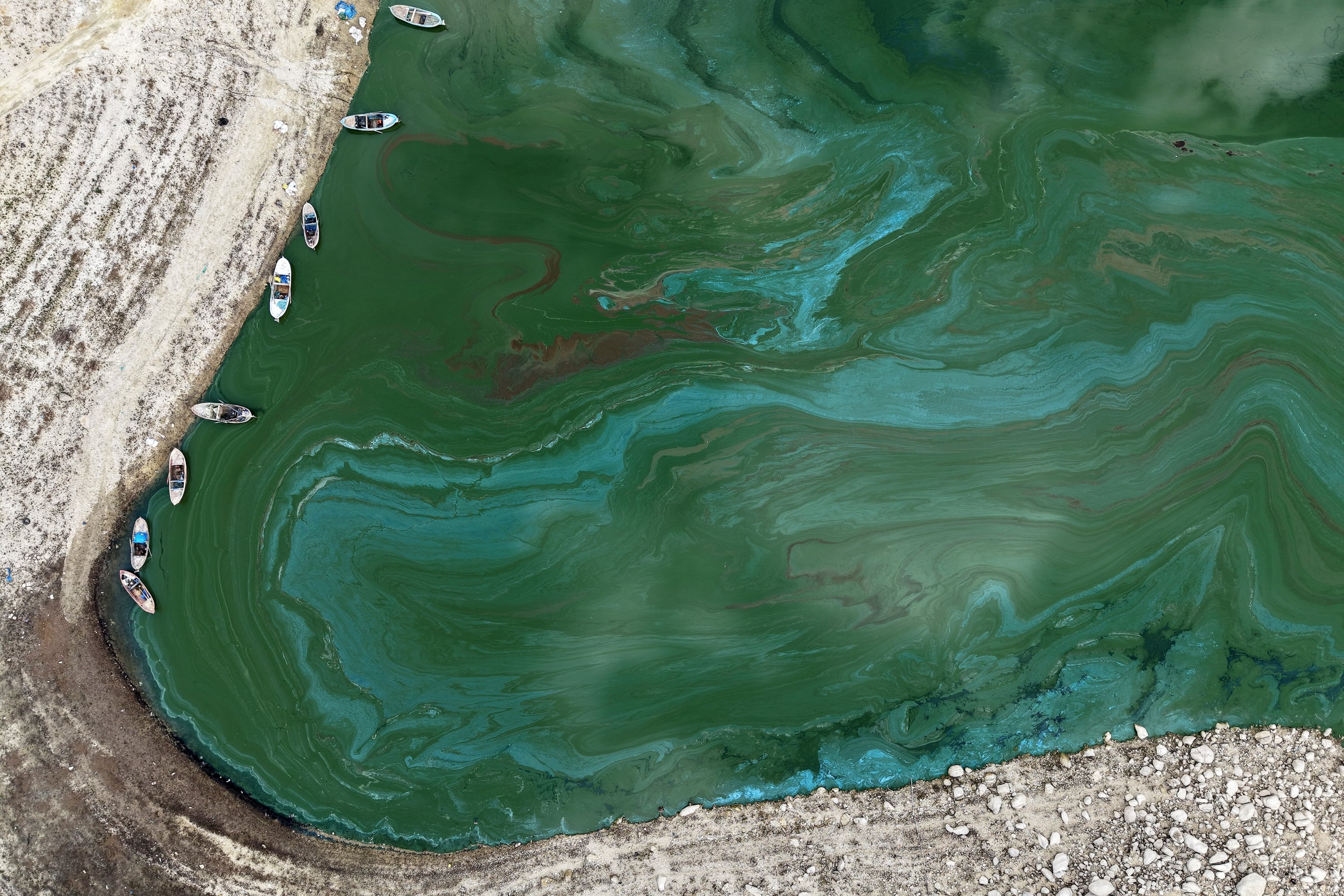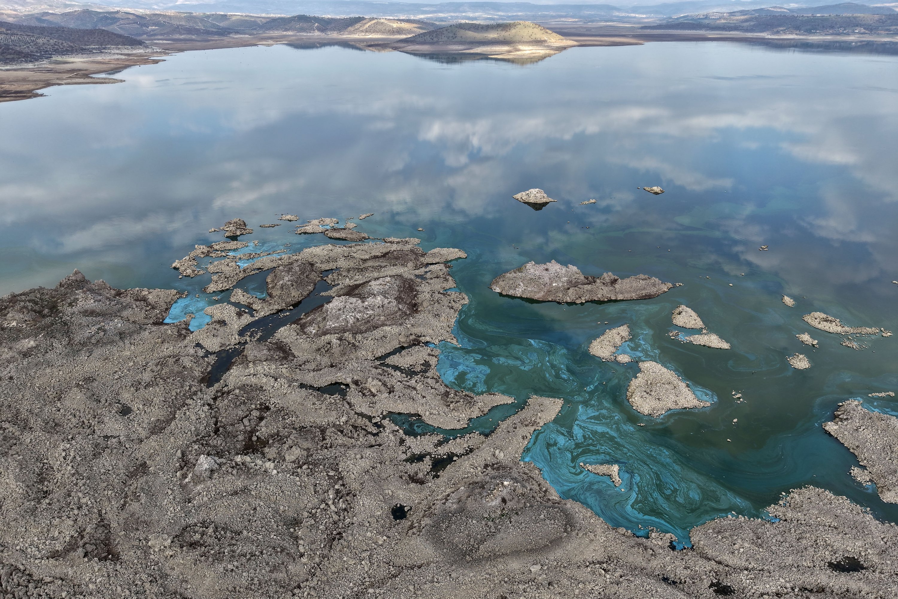 Algae spreads across the surface of Demirköprü Dam’s reservoir in the Salihli district of Manisa, Türkiye, after falling water levels caused by drought and agricultural irrigation exposed large areas of land, Jan. 8, 2025.