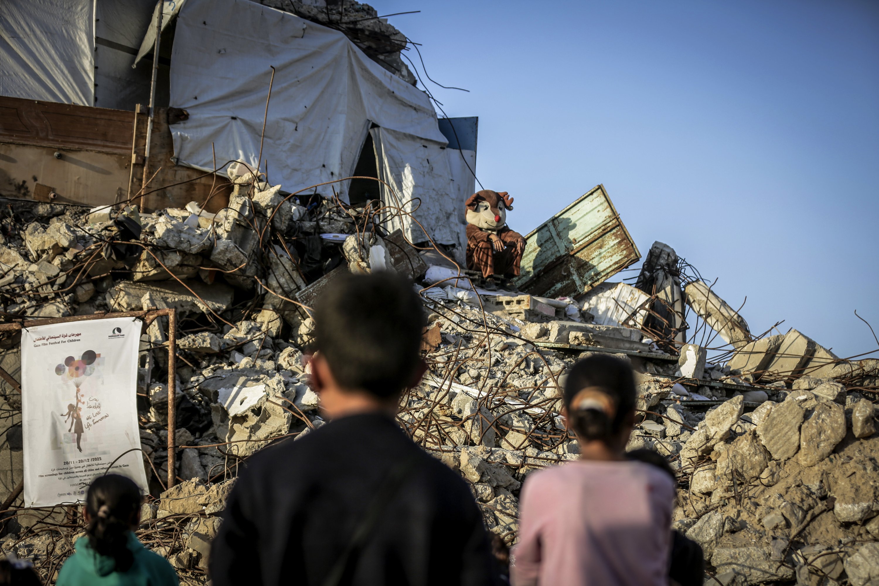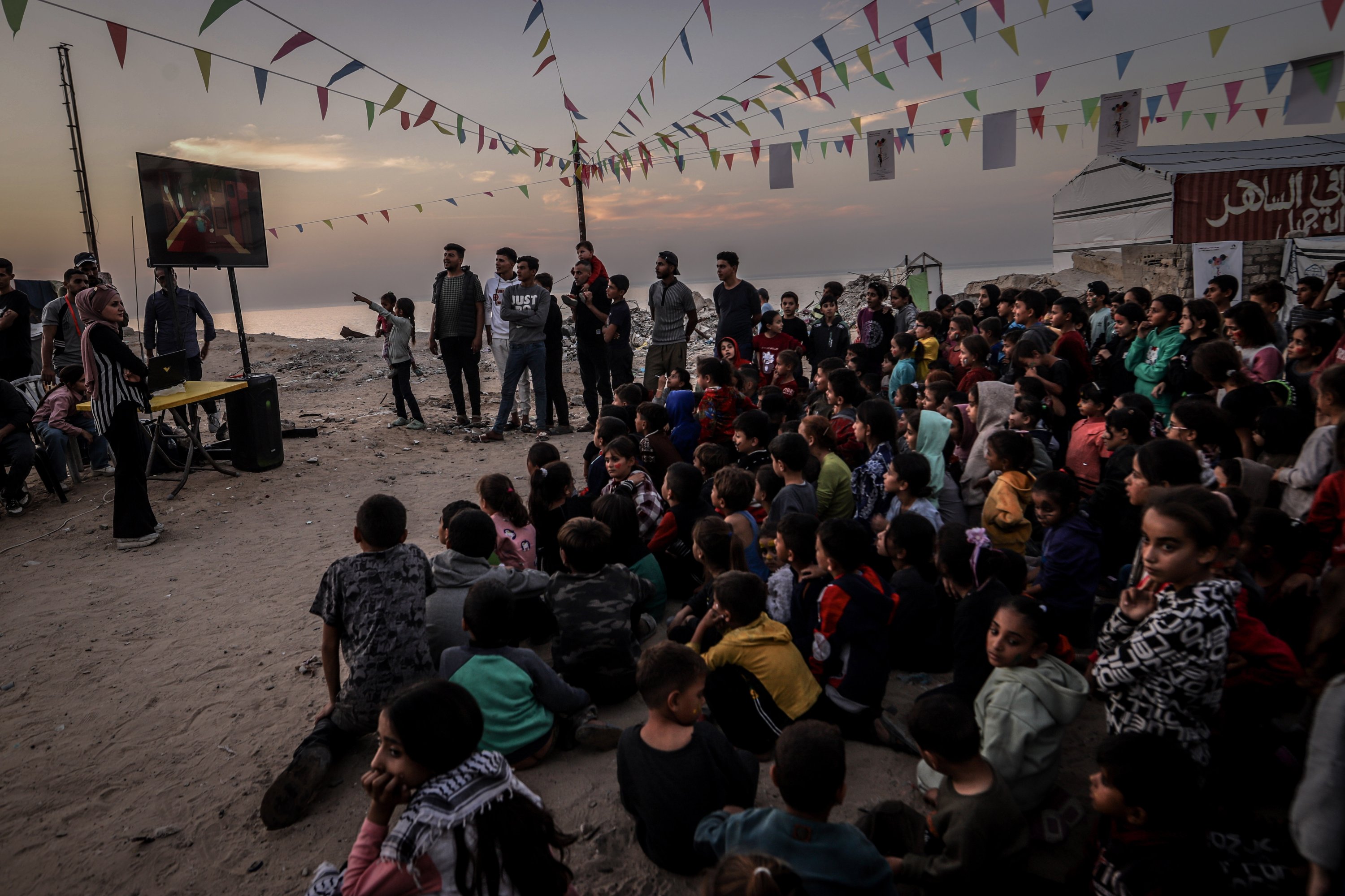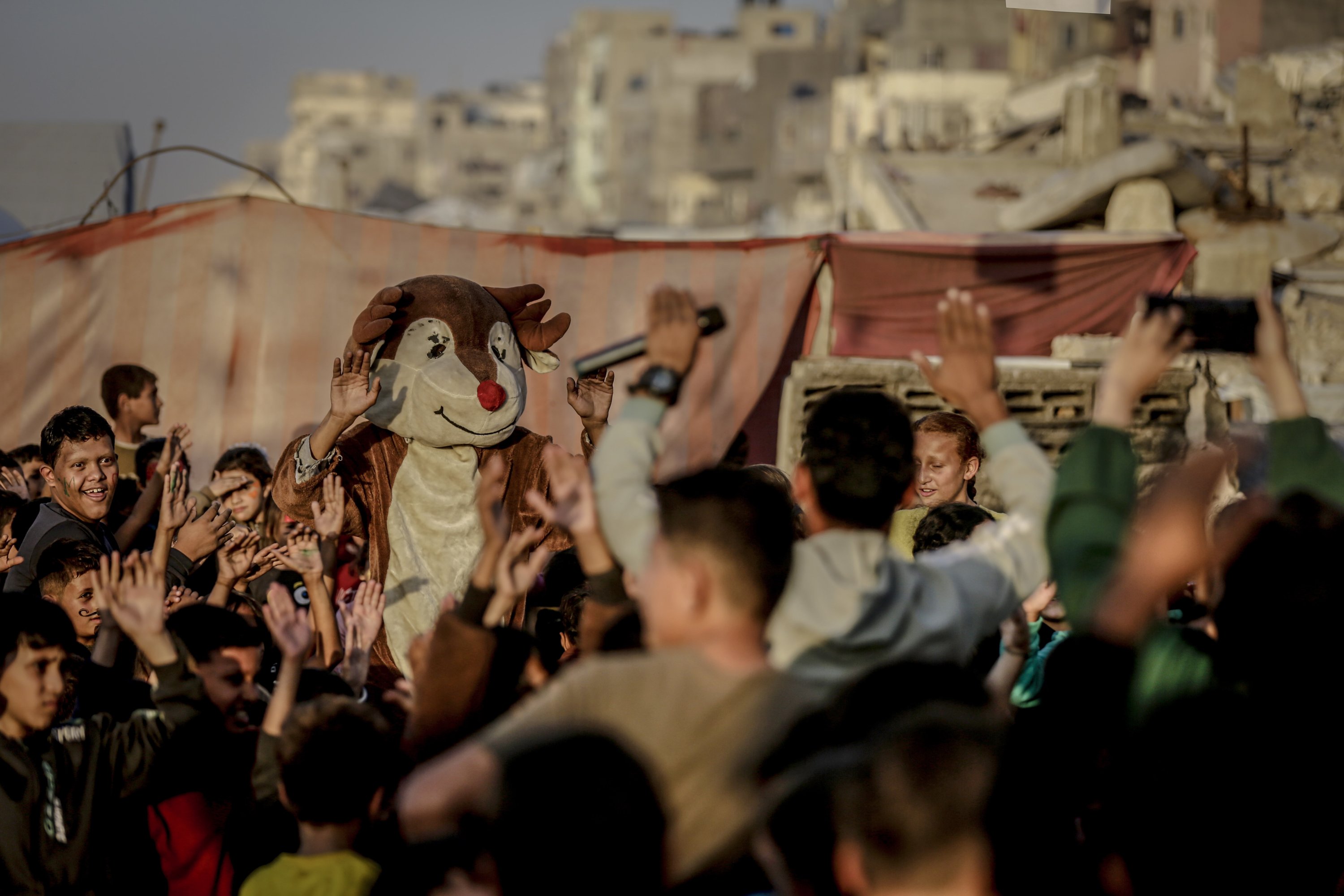 Young Palestinian volunteers held a children’s entertainment event amid rubble in Gaza’s Shati Refugee Camp, bringing moments of joy despite ongoing Israeli attacks, the Gaza Strip, Palestine, Nov. 23, 2025.
