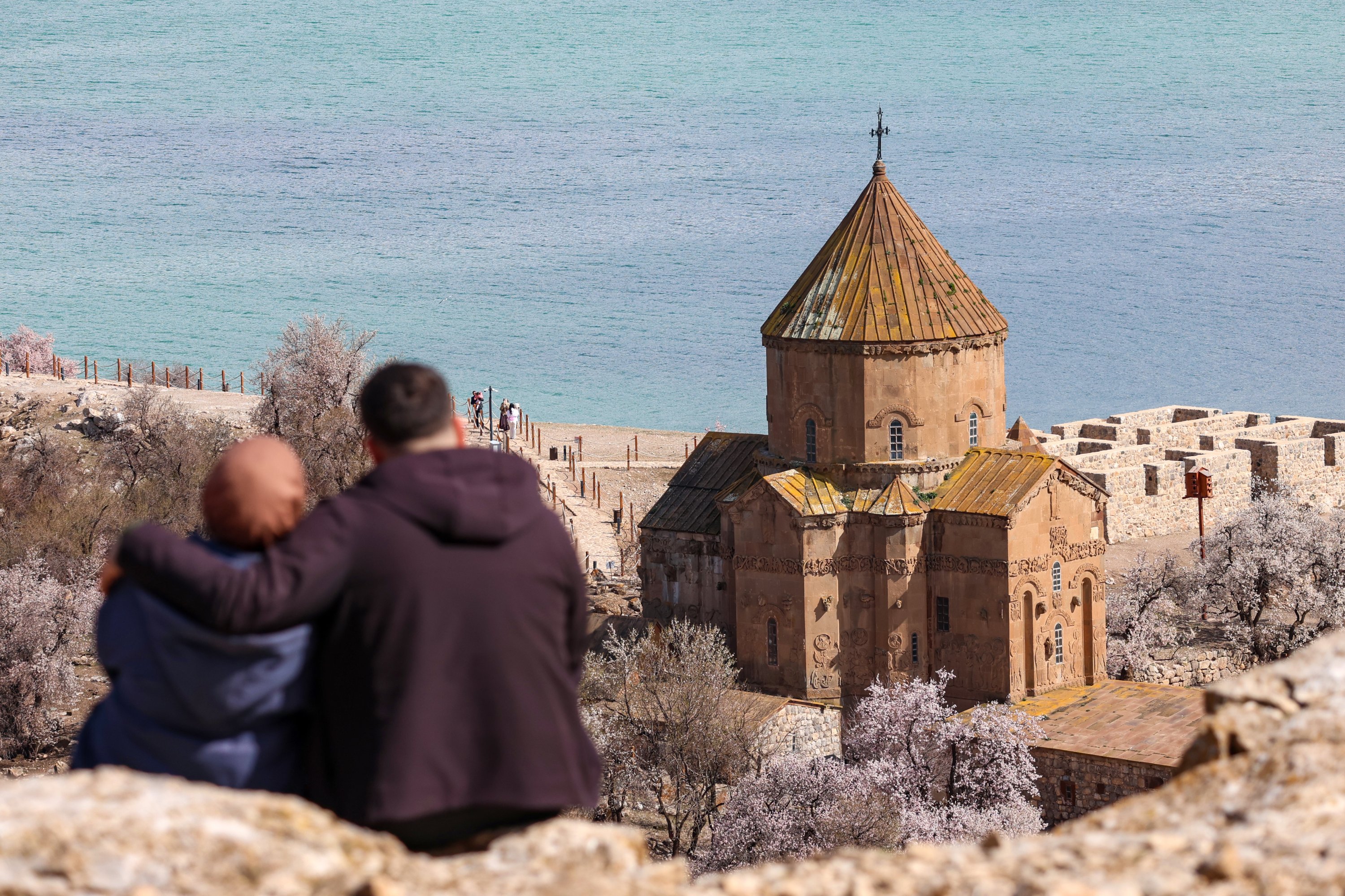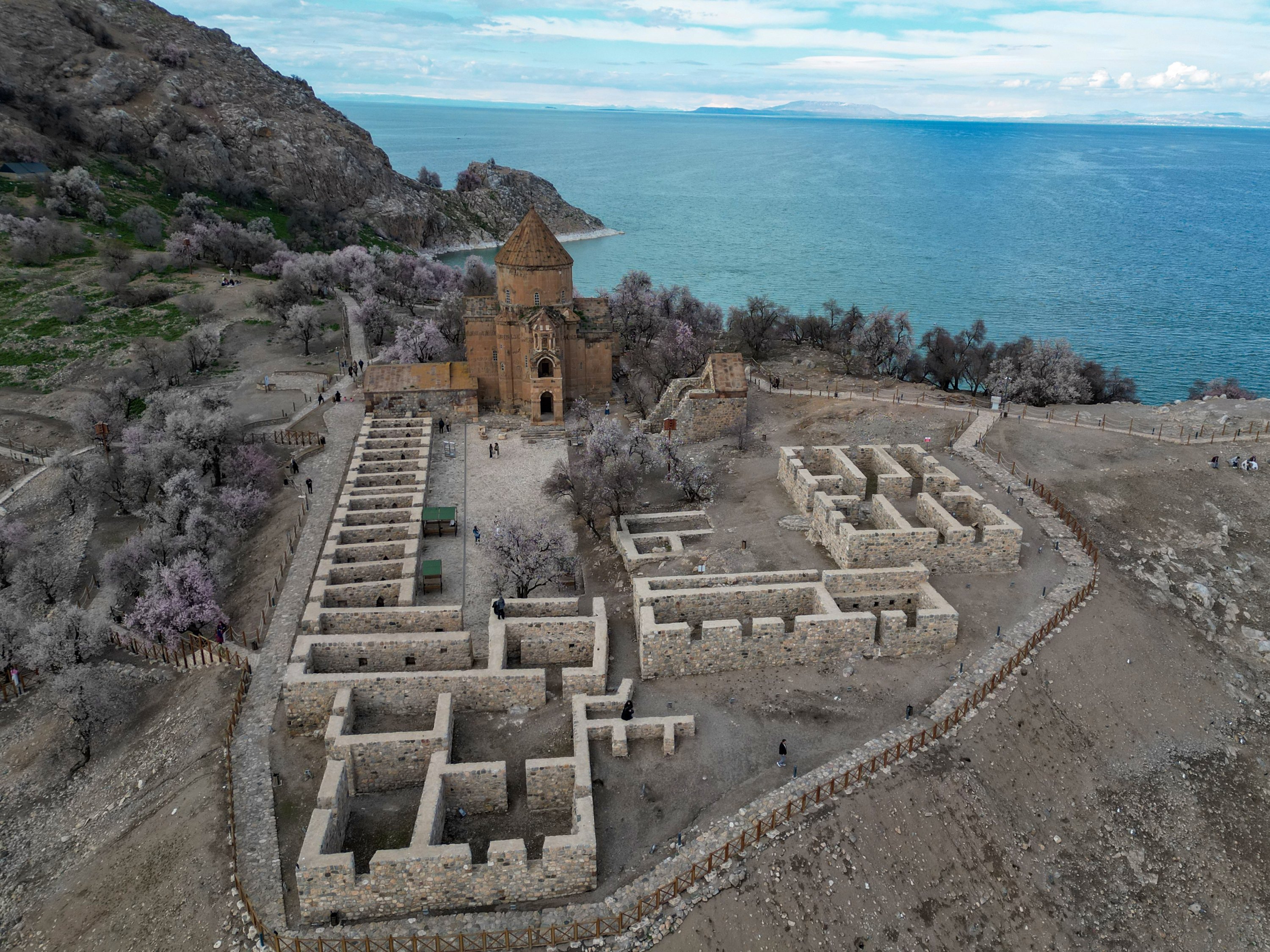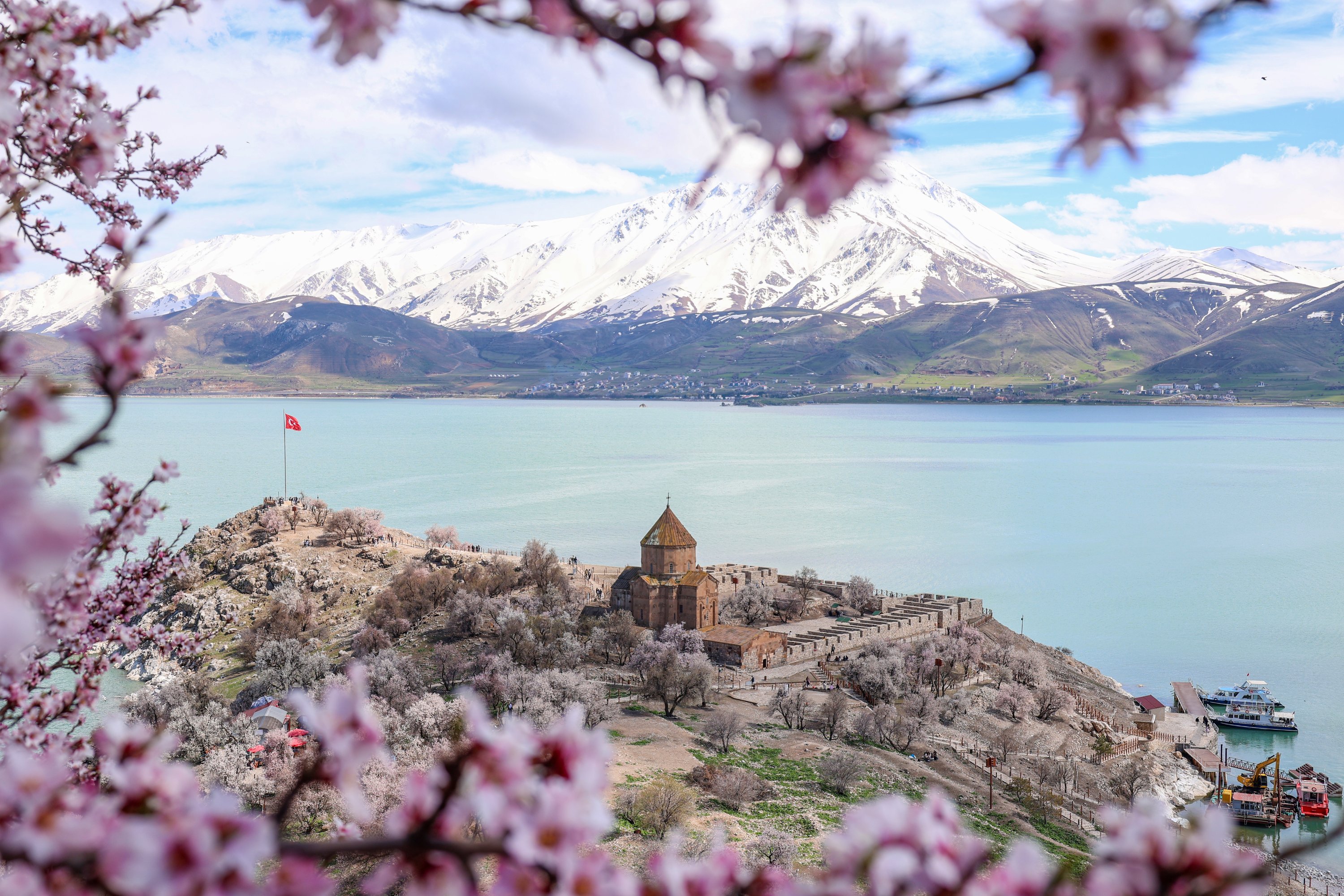 Almond trees bloom across Akdamar Island, one of the most visited sites in Lake Van, as the island is covered in spring colors, Van, eastern Türkiye, April 23, 2026.