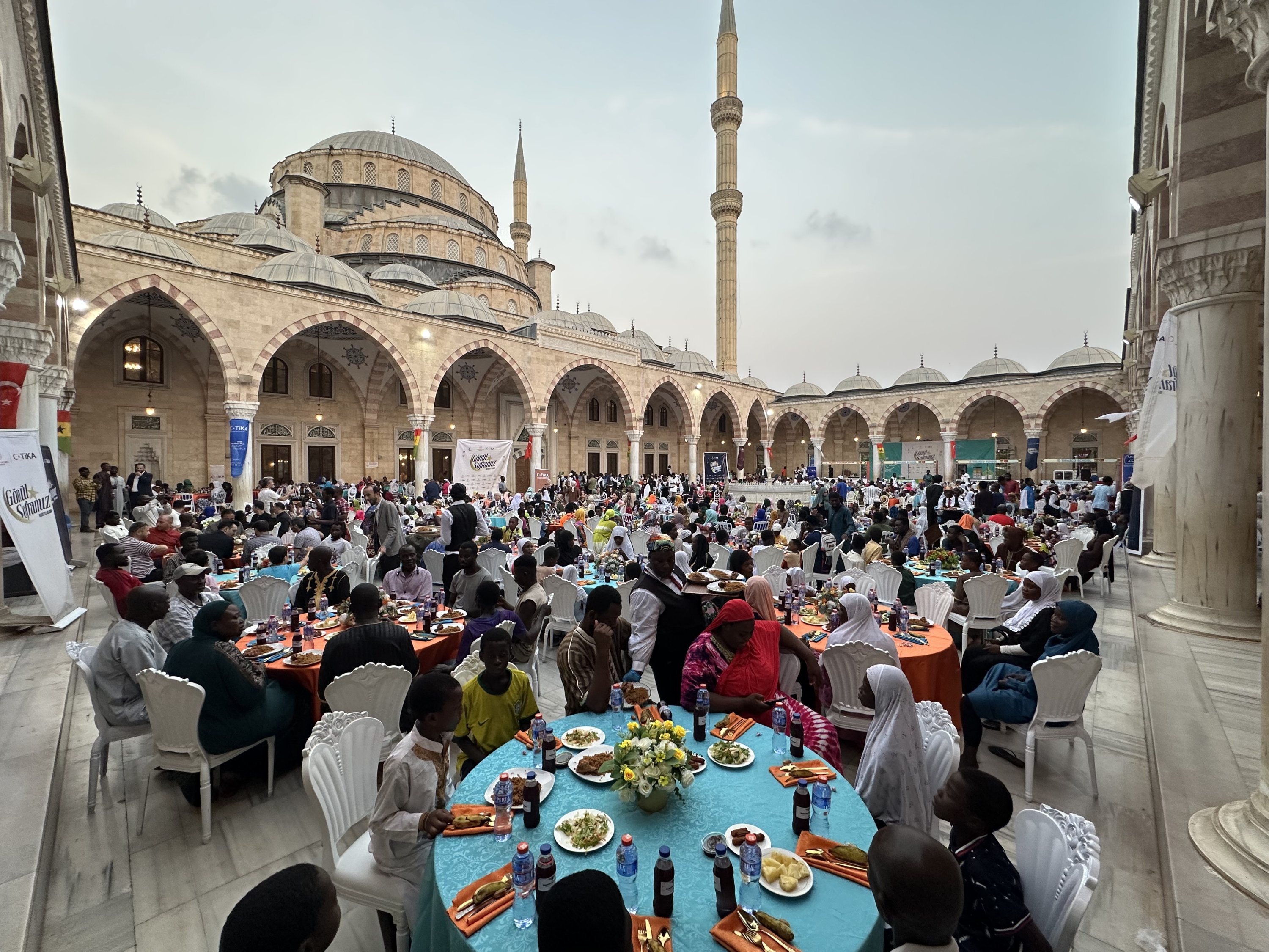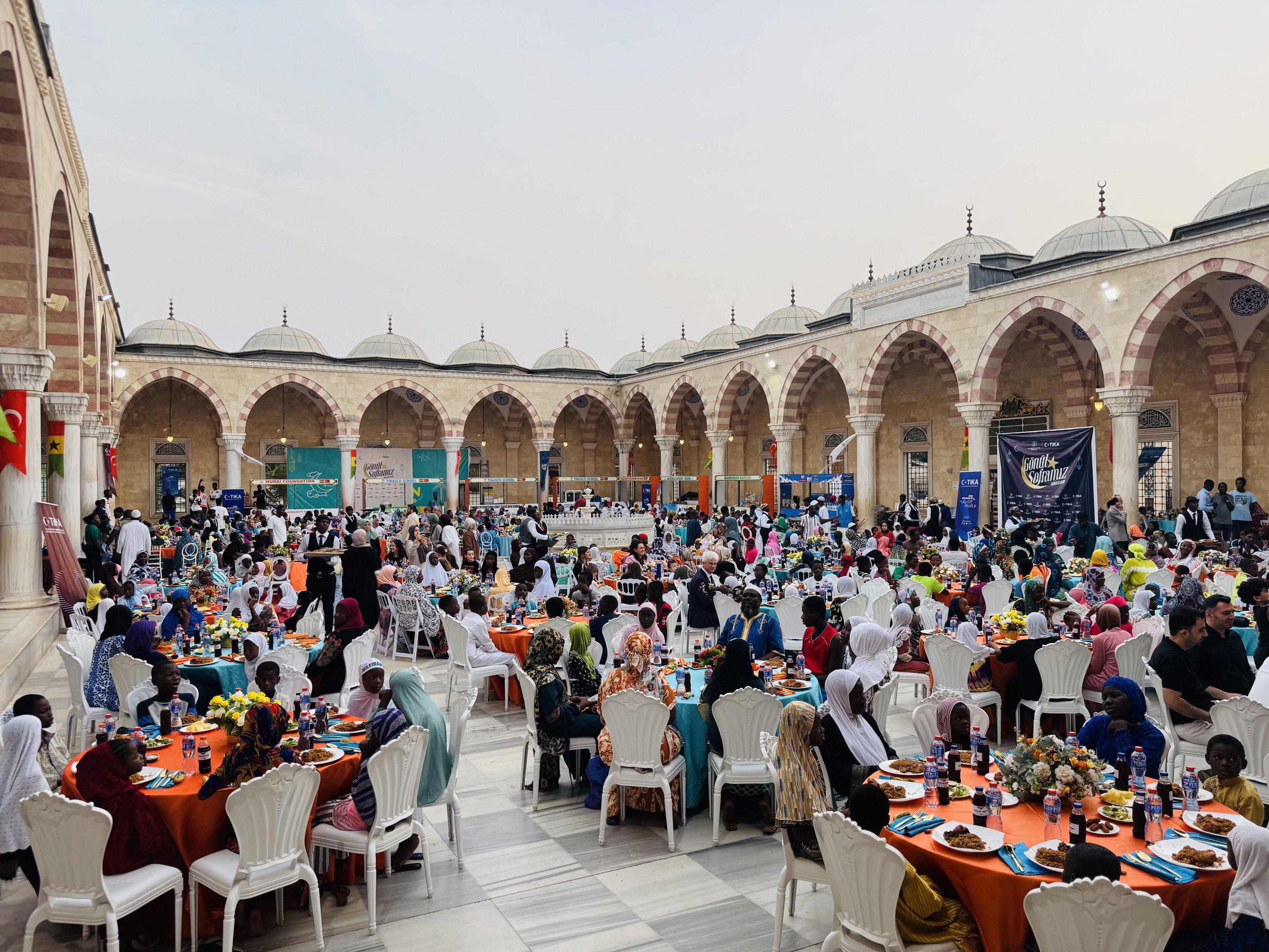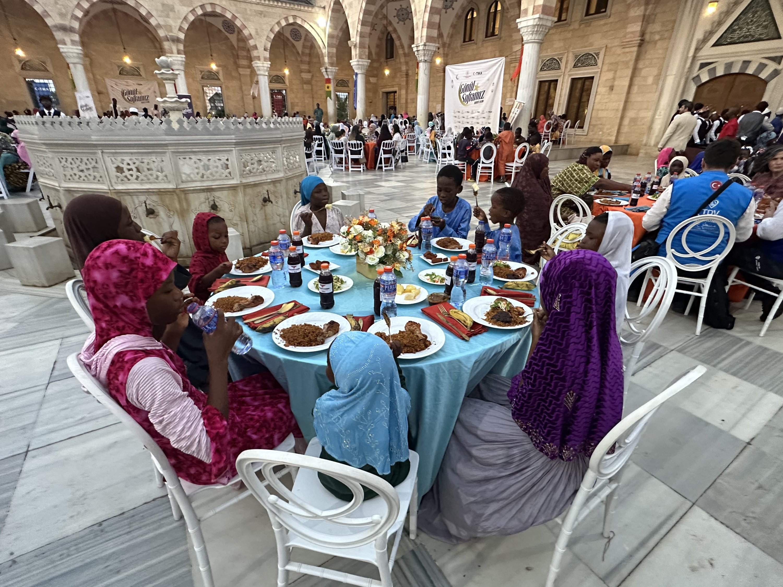 Orphaned children gather for an iftar meal during a Ramadan program organized by the Turkish Cooperation and Coordination Agency (TlKA) and the Aziz Mahmud Hüdayi Foundation in the courtyard of the Ghana National Mosque, where around 1,000 children were hosted for the fast-breaking event, Accra, Ghana, March 8, 2026.