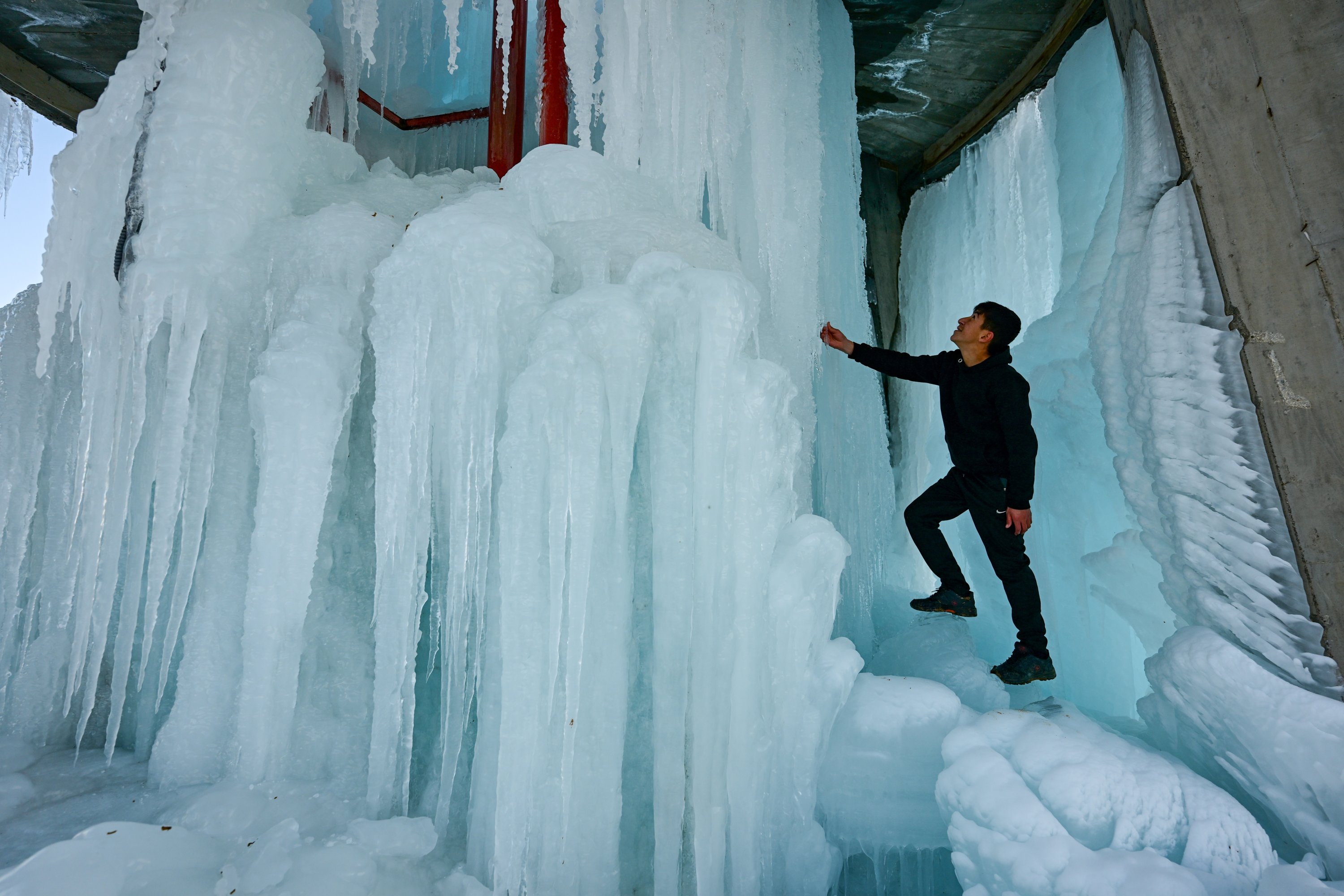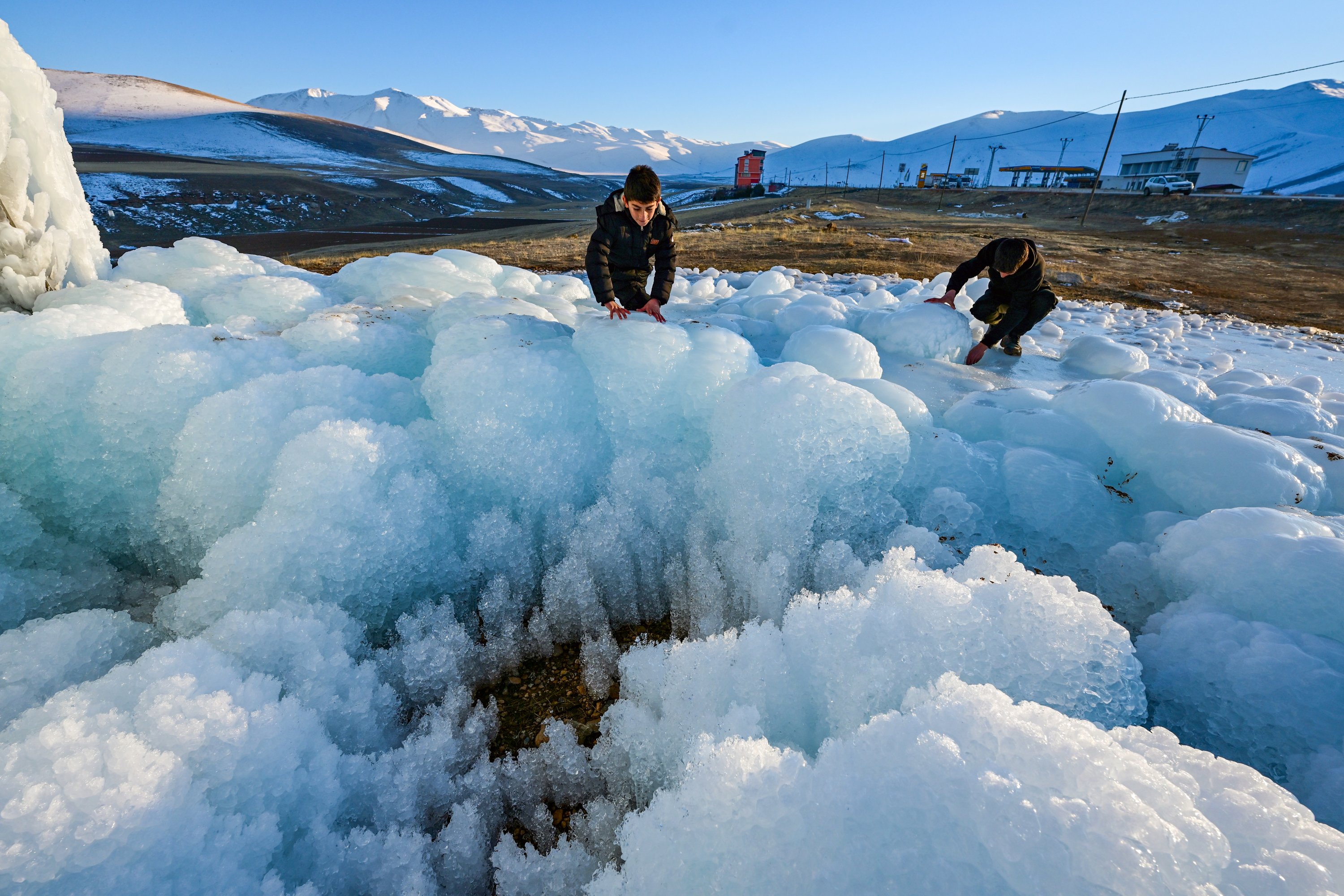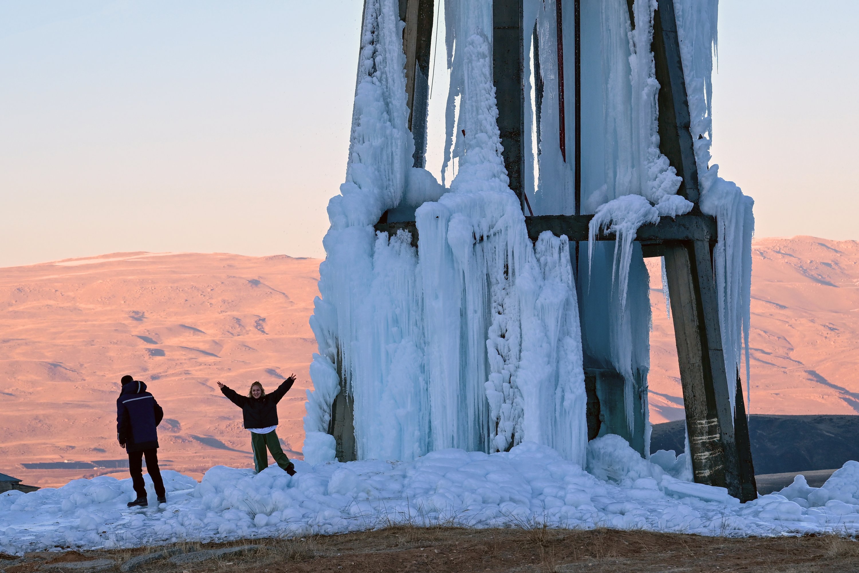 A view of the elevated tank, covered with icicles formed by the freezing of water flowing from burst pipes due to extreme cold, in the Gevaş district of Van, Türkiye, Jan. 30, 2025.