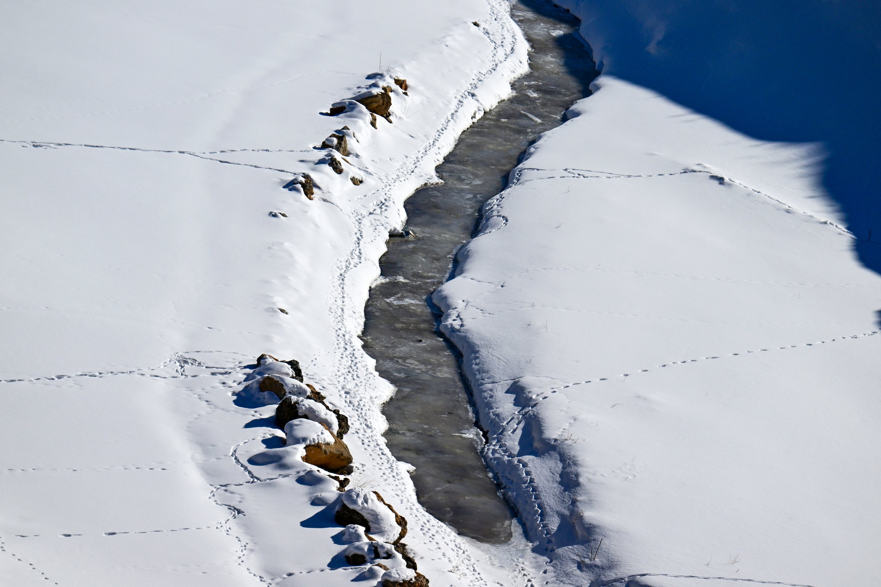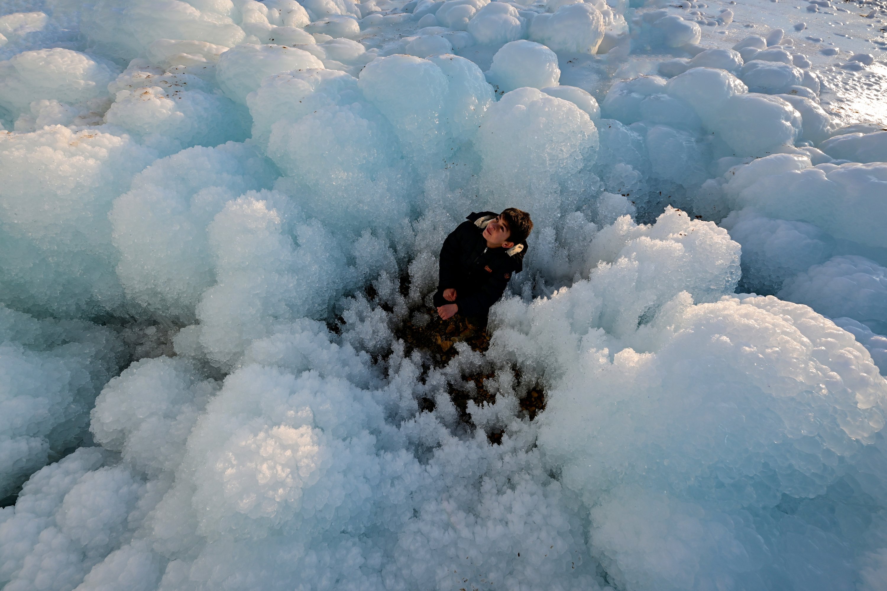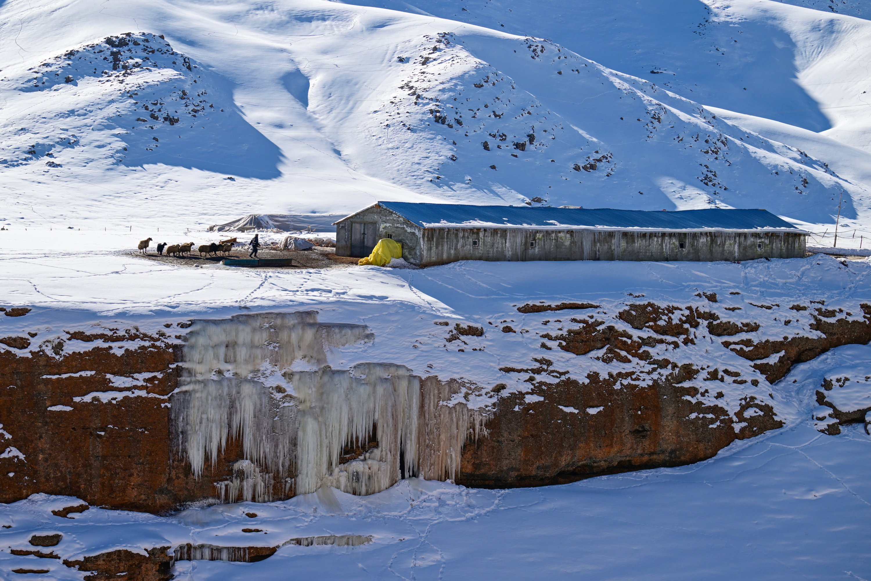 A view of the elevated tank, covered with icicles formed by the freezing of water flowing from burst pipes due to extreme cold, in the Gevaş district of Van, Türkiye, Jan. 30, 2025.