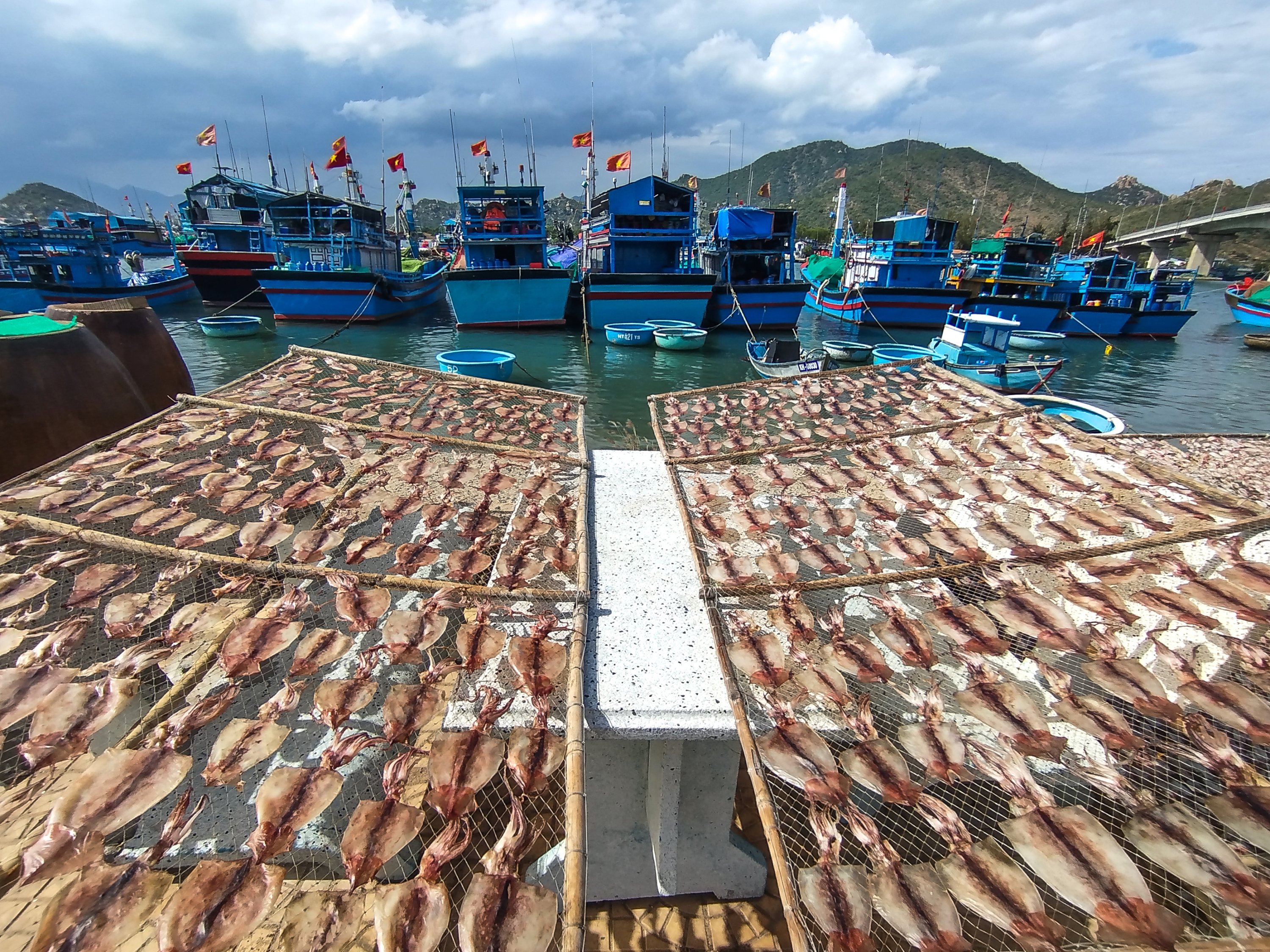 A woman holds a frame for dried fish near Nai Market (Du Khanh Market), July 8, 2025. The market stands out as the region’s largest fishing village and seafood market in Khanh Hai of Vietnam’s Ninh Thuan province.