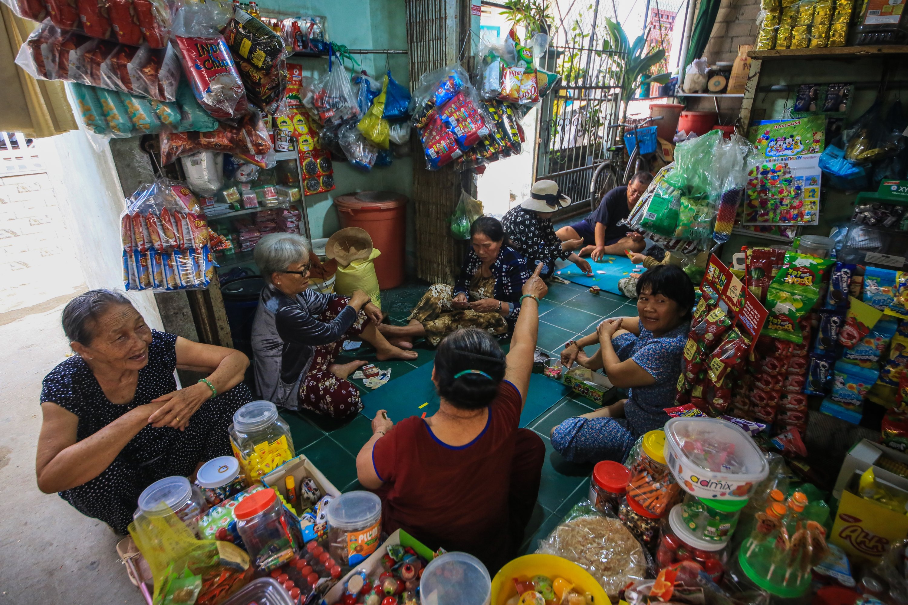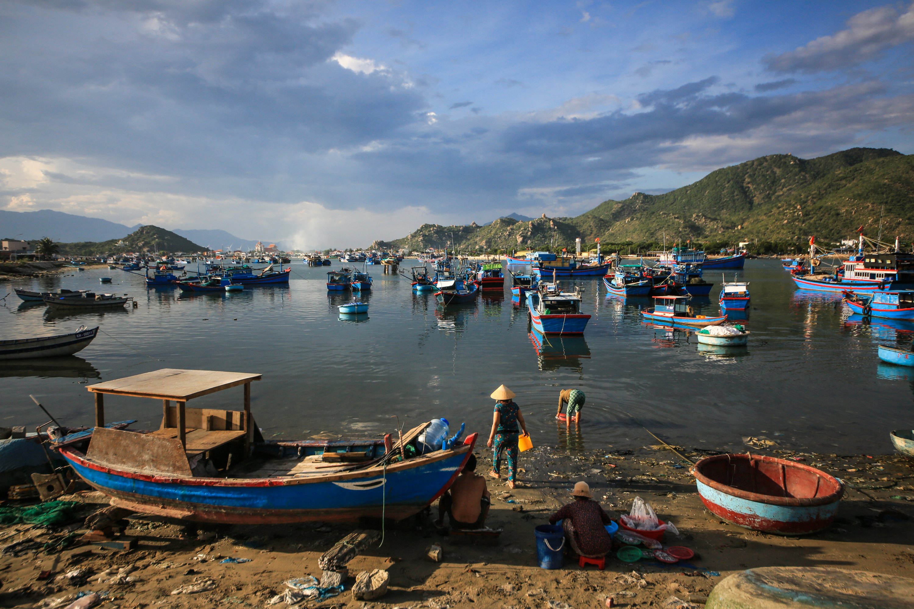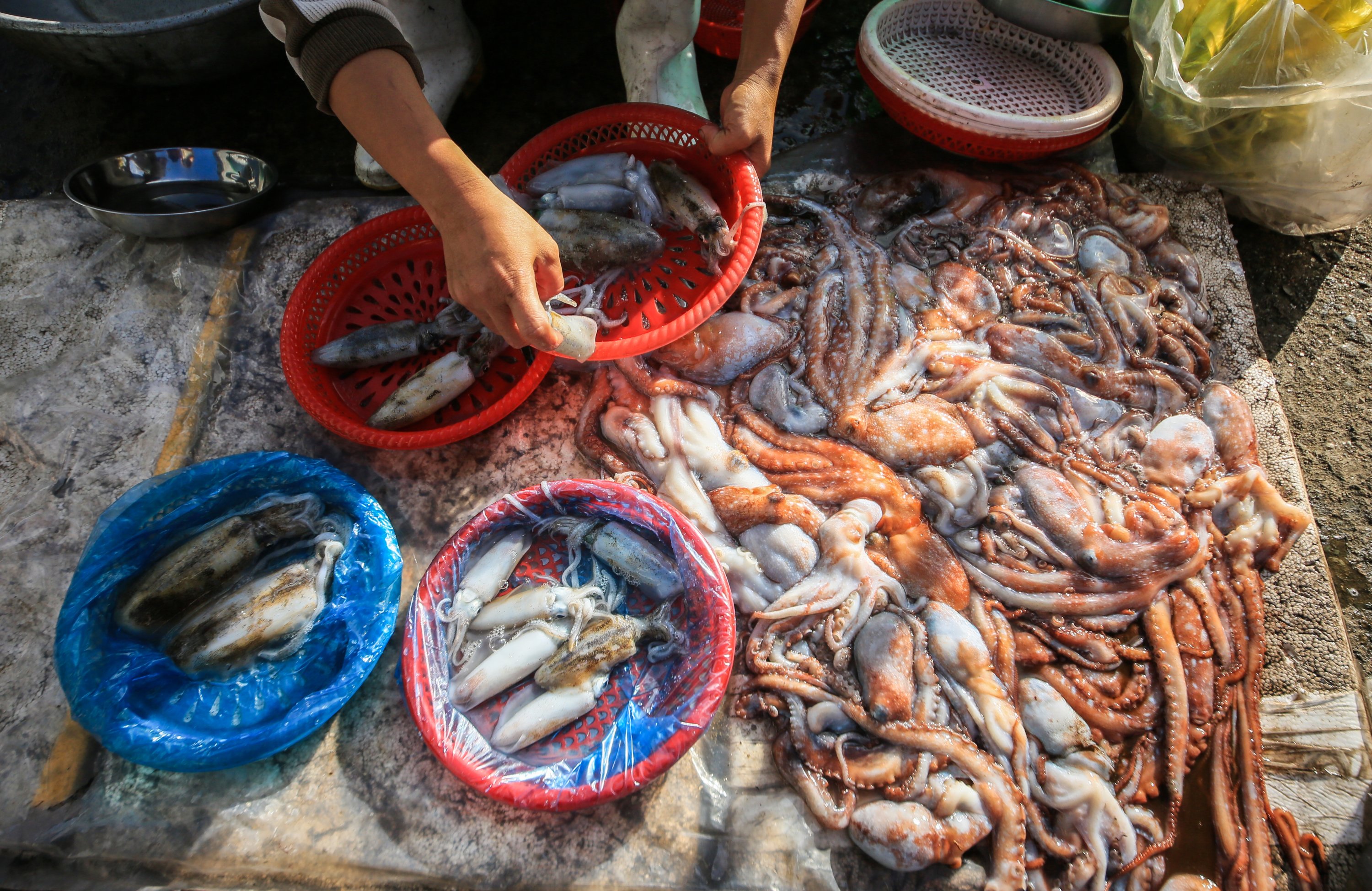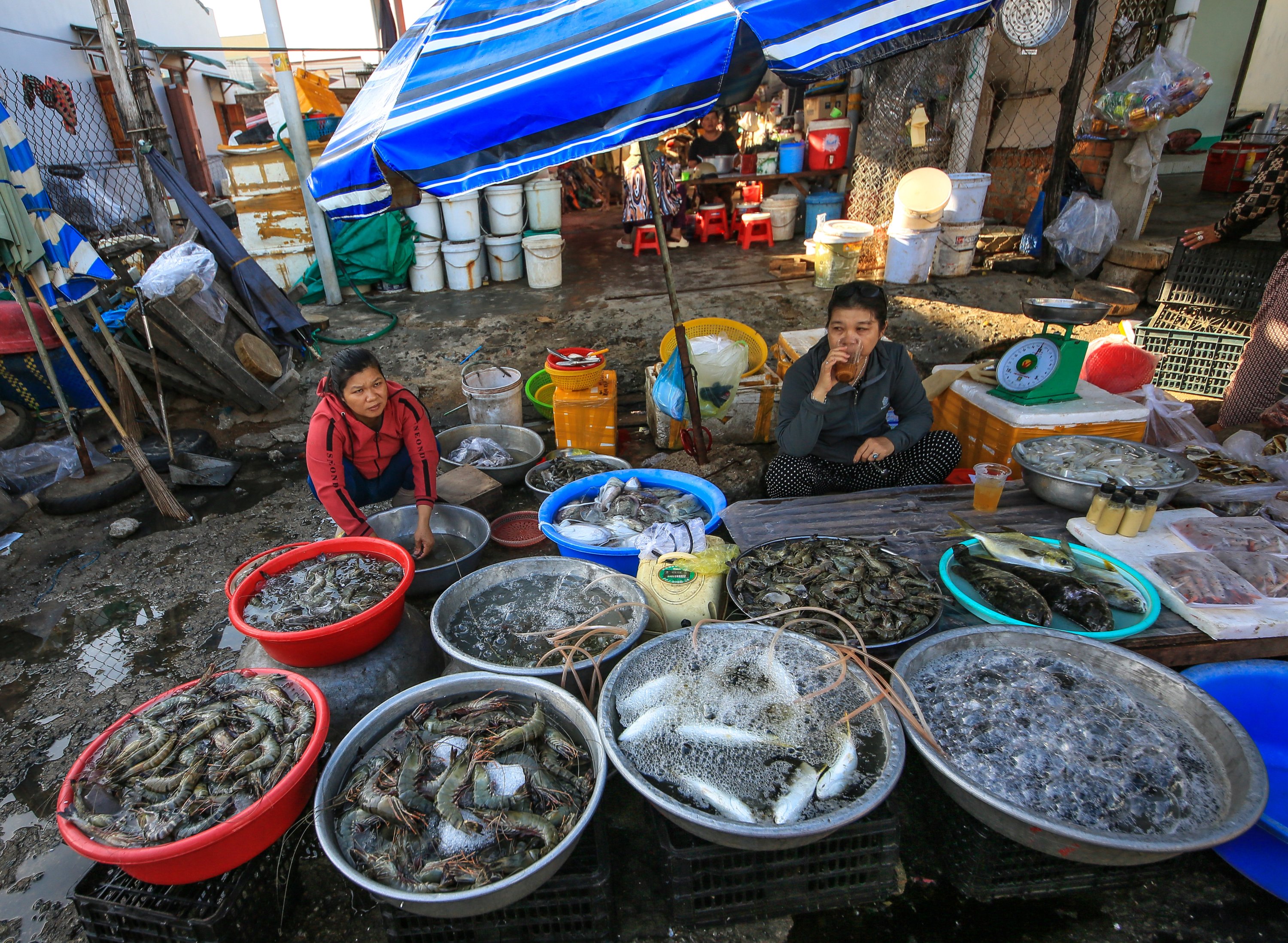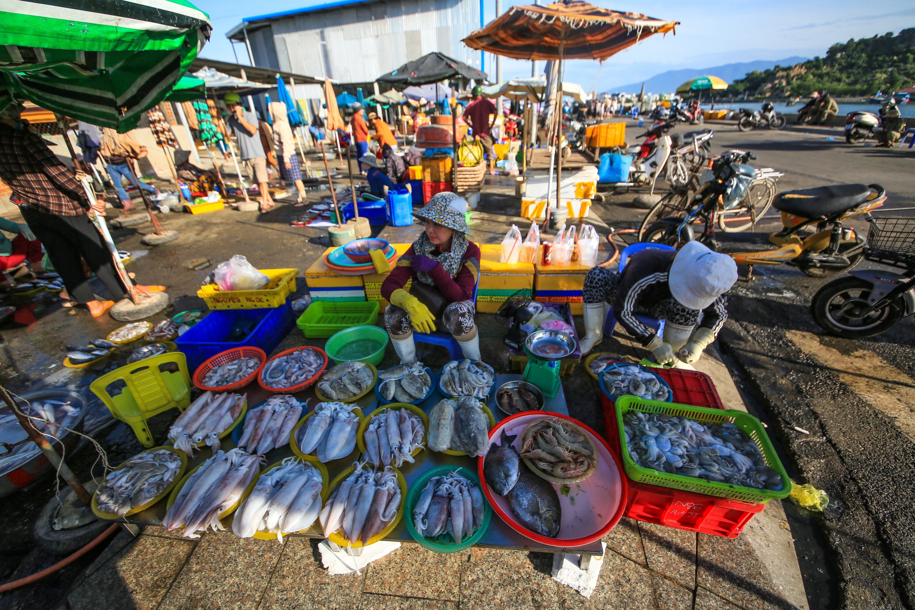 From early morning, fresh catches brought in by fishing boats fill the market, where women both sell and dry seafood. After trading ends, villagers spend time playing traditional games.