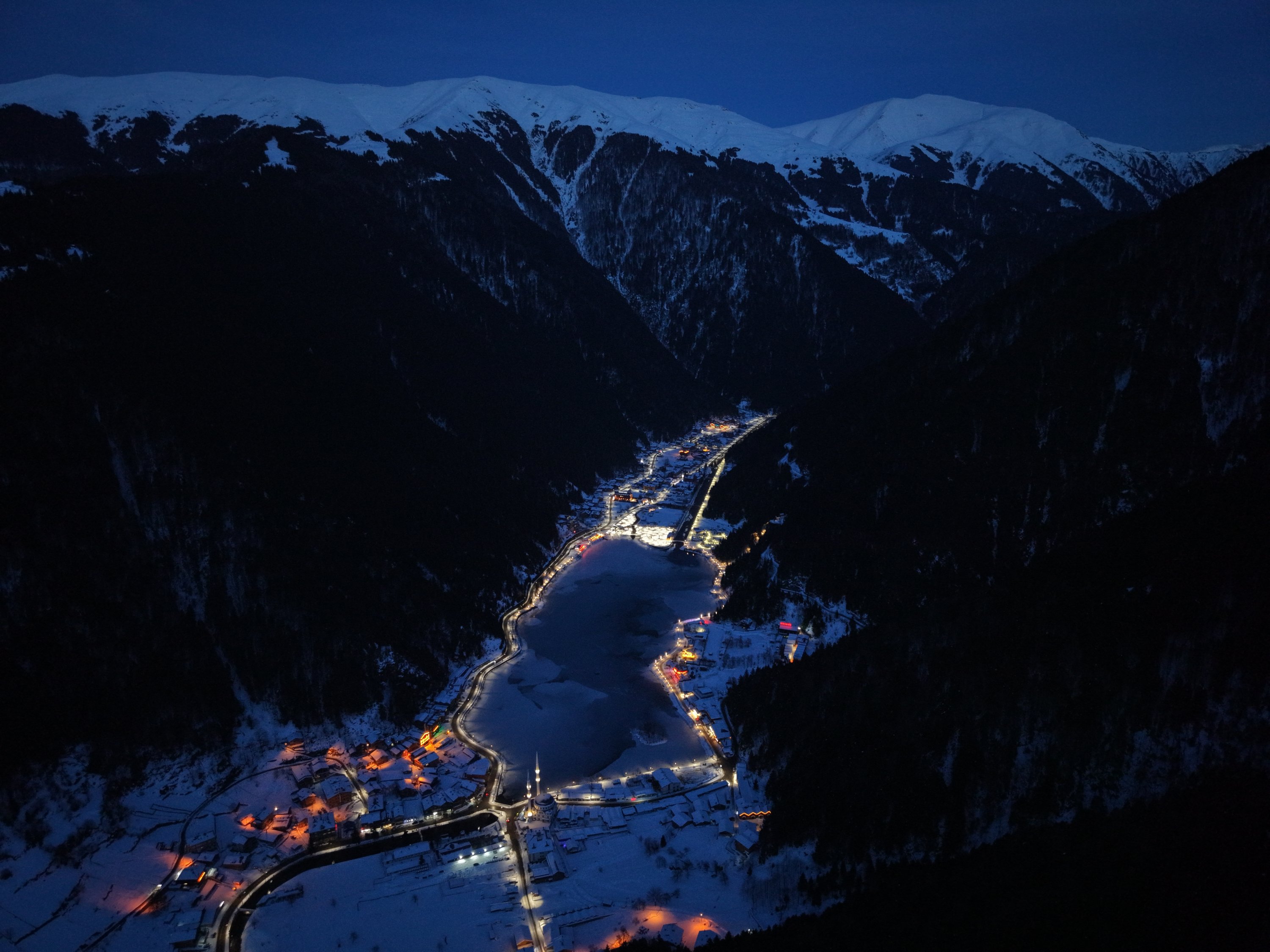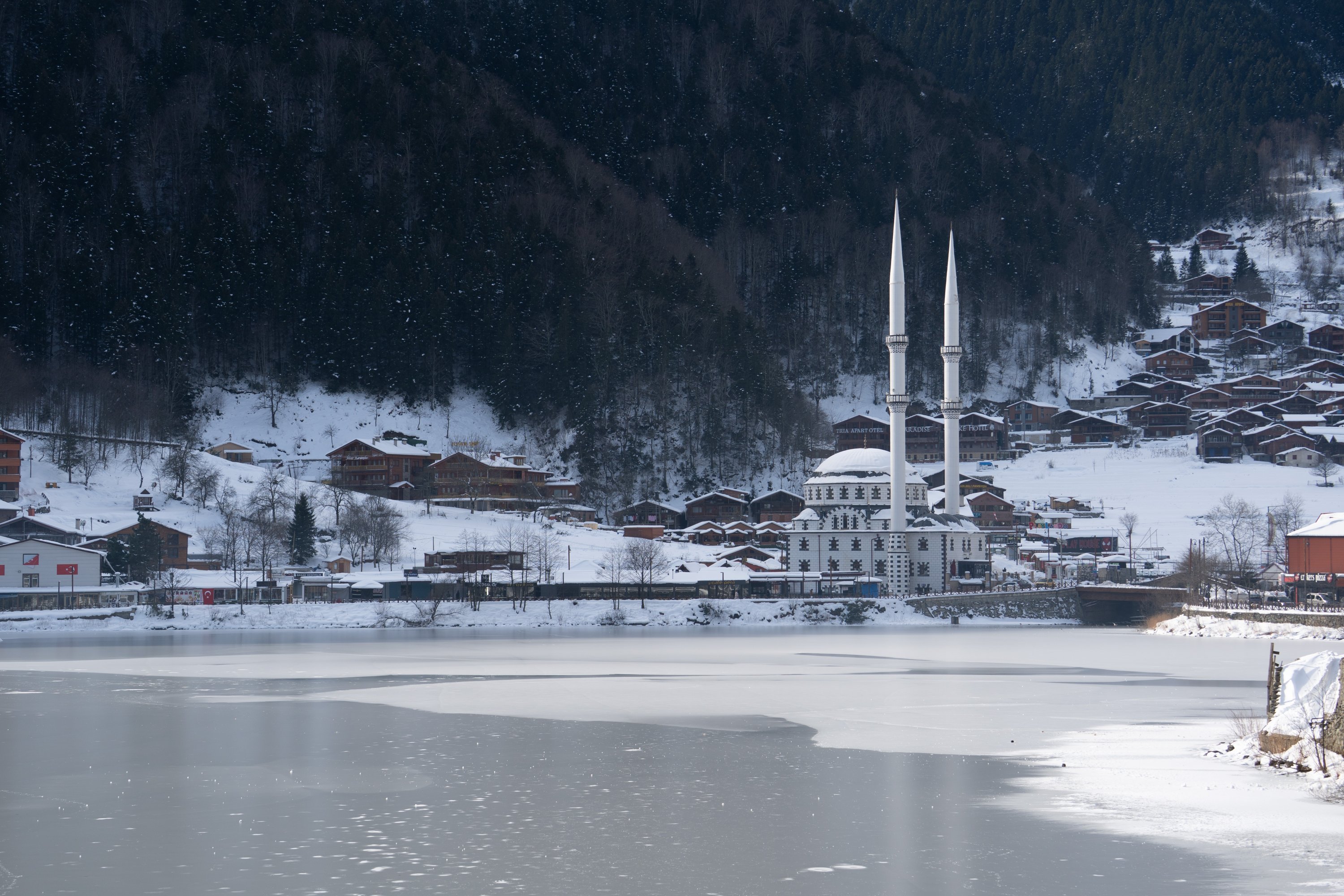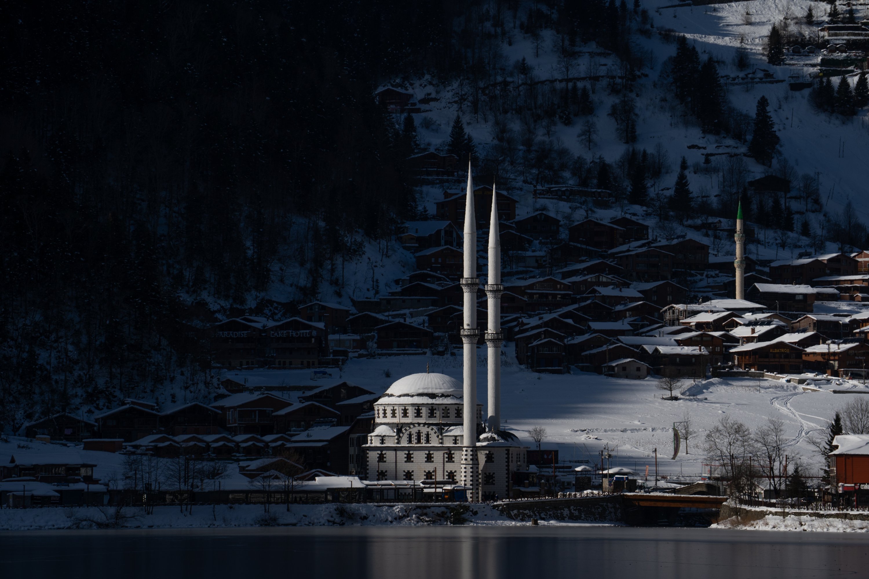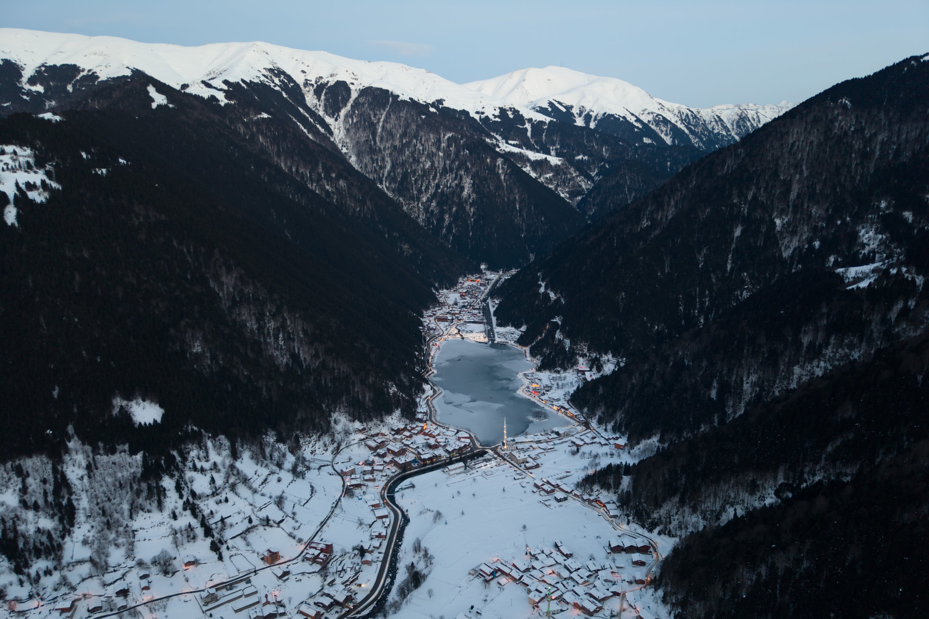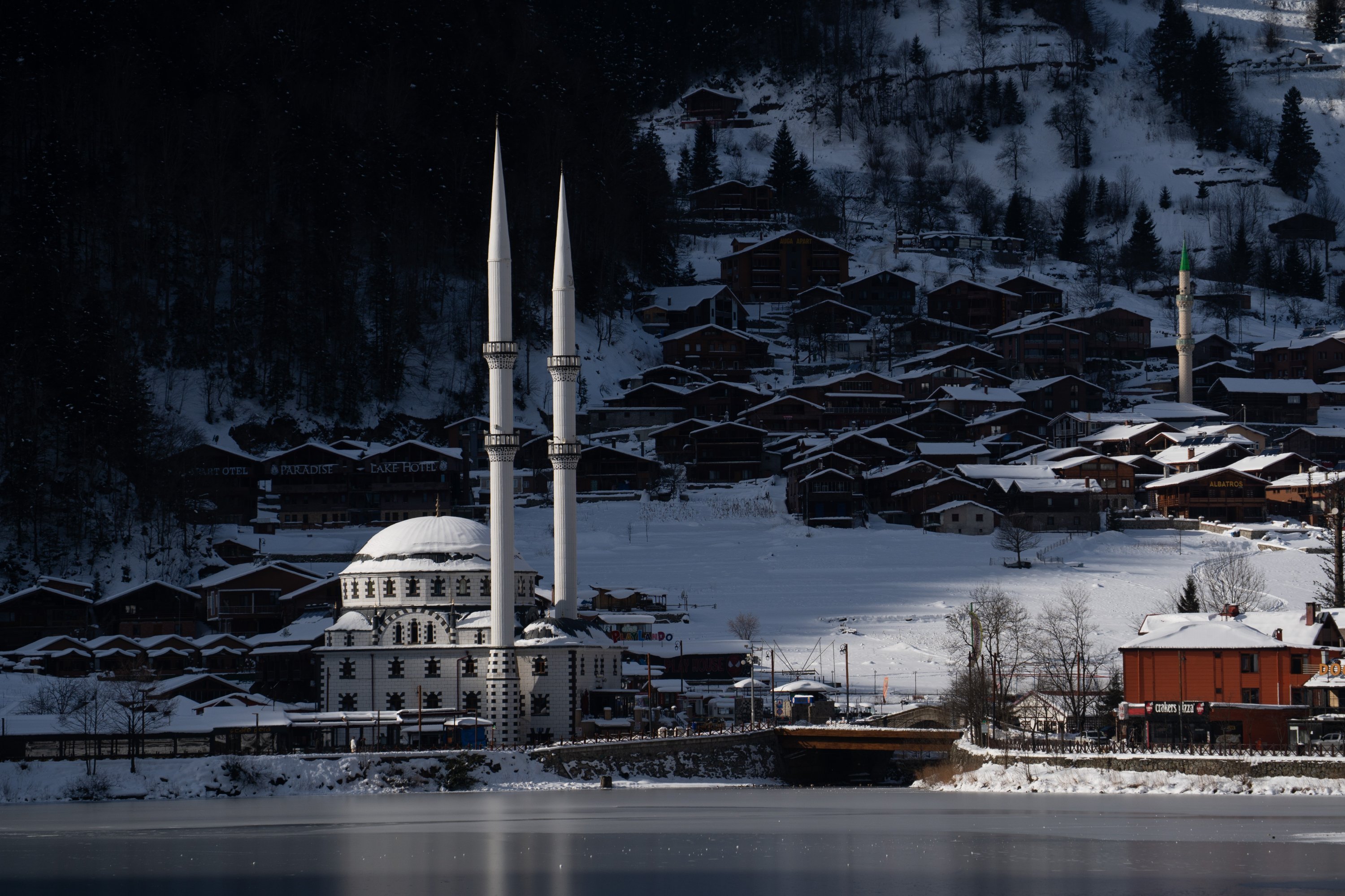 A view of Uzungol Lake in the Caykara district of Trabzon, one of the most visited tourist destinations in the eastern Black Sea region, as most of its surface froze due to cold weather, northern Türkiye, Jan. 4, 2026.