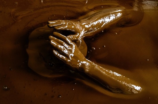 Immersed up to her neck in a dark viscous liquid, Sulfiya smiles in delight, confident that the fetid substance will cure her painful condition.