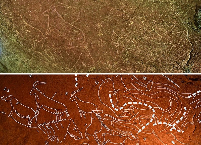 This combination of two undated handout pictures released by Diputacion Foral de Bizkaia on October 13, 2016 shows cave engravings (top) representing animals like horses, bisons, lions or goats, and a highlighted version, in the Armintxe cave in the Basque village of Lekeitio (AFP Photo)