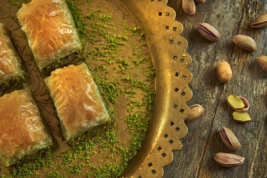 Being one of the Ottoman Empire's signature desserts, baklava is prepared in large pans, and it is quite entertaining to watch chefs while doing so. Many layers of phyllo dough separated with butter and layers of pistachios are placed in the pan. There are also some versions of baklava made from walnuts and hazelnuts, but the baklava in Antep is definitely always made with pistachios. Eating baklava in Gaziantep is an art; you first need to turn the baklava upside down so the base touches your palate and eat in one bit.