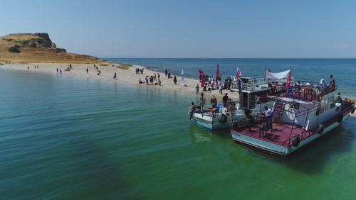It took 50 swimmers, including divers, around two hours to reach the Çarpanak Island in Lake Van.