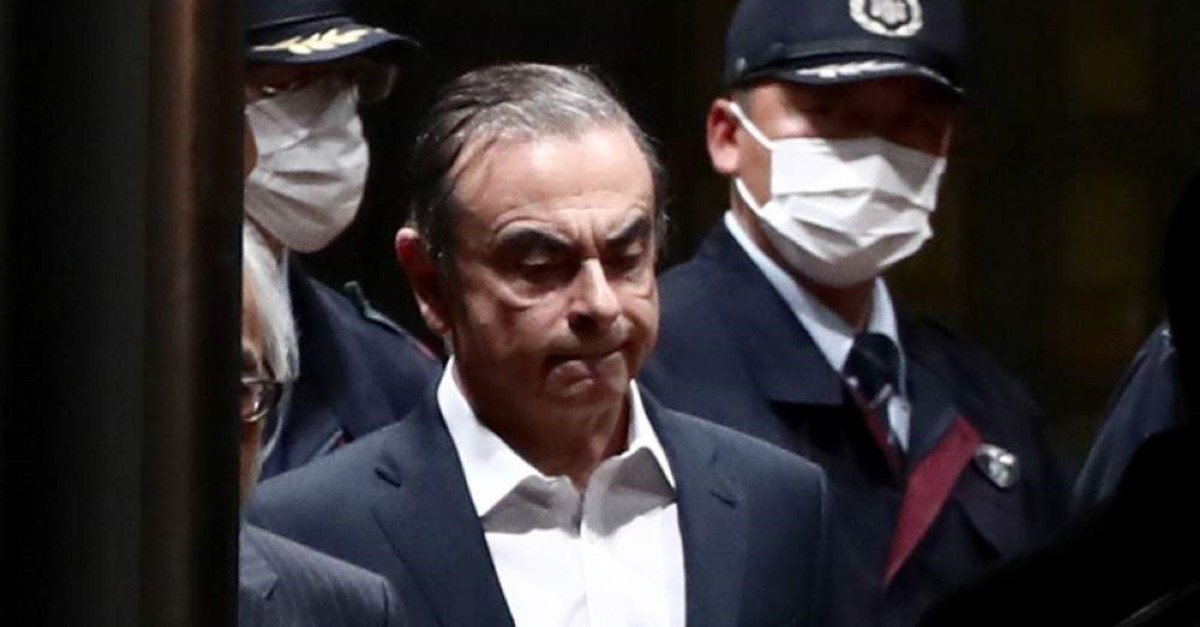 In this file photo taken on April 25, 2019, former Nissan chairman Carlos Ghosn (C) is escorted as he walks out of the Tokyo Detention House following his release on bail in Tokyo. (AFP Photo)