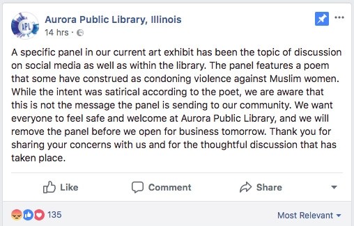 A few hours after the initial Facebook post regarding the poem, the library announced that the panel would be taken down within a day.