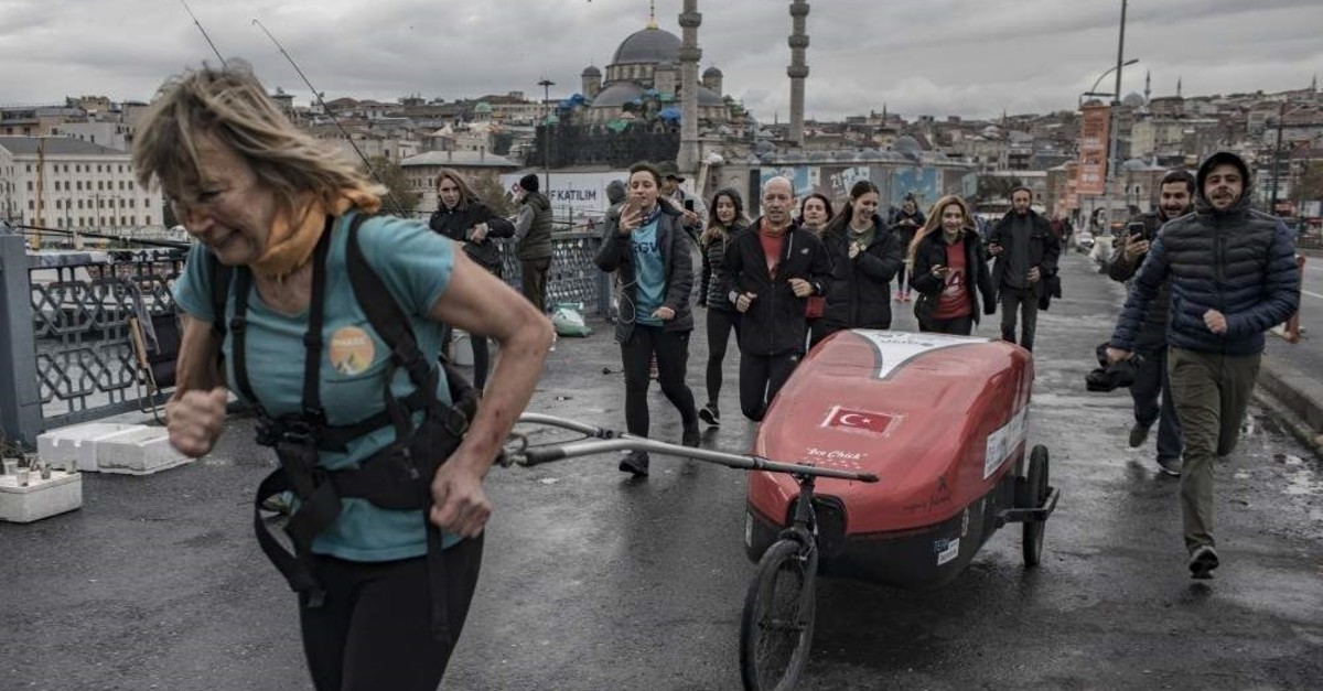 Sharing a video of herself running on the Galata Bridge, which spans the Golden Horn, an ancient harbor in the city, she tweeted: "Is it a bird? Is it a plane? No! It's me running across Galata Bridge on a 6,000-mile journey across the world from the UK to Nepal, pulling everything I own in a cart behind me."