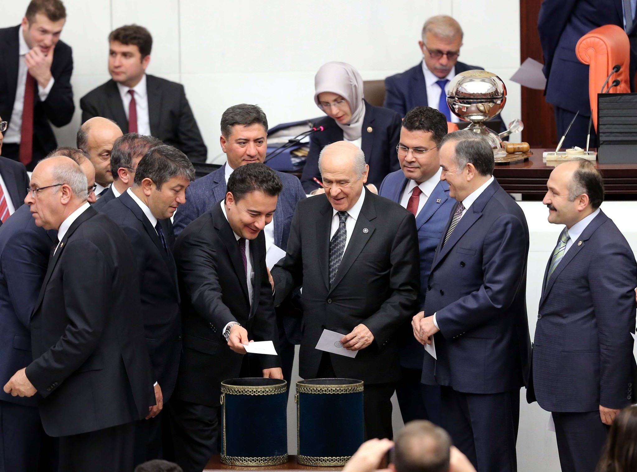 AK Party Ankara deputy Babacan (C-L) having a talk with MHP leader Bahçeli (C-R) in front of ballot boxes in a voting session for in the parliament in Ankara on May 20.
