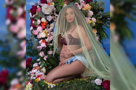 Surrounded by flowers and clad in a sweeping green veil, Queen Bey shows off her baby bump in the Madonna-inspired photo .