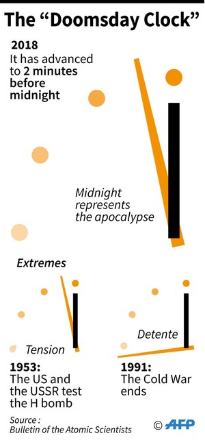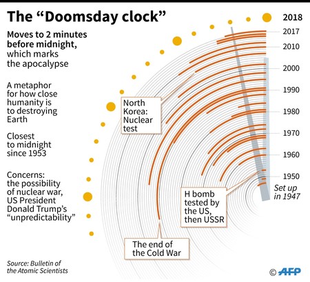 Mounting concerns about the possibility of a nuclear war, along with U.S. President Donald Trump's "unpredictability" have pushed the symbolic "Doomsday Clock" to two minutes before midnight, the Bulletin of Atomic Scientists said Thursday.