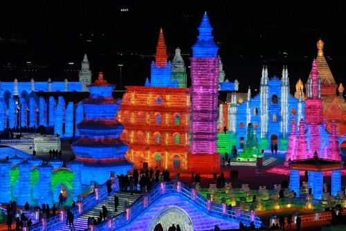 Highlights include sled rides on the Songhua river, mass weddings, and towering sculptures of ice and snow carved by thousands of artists and workers.