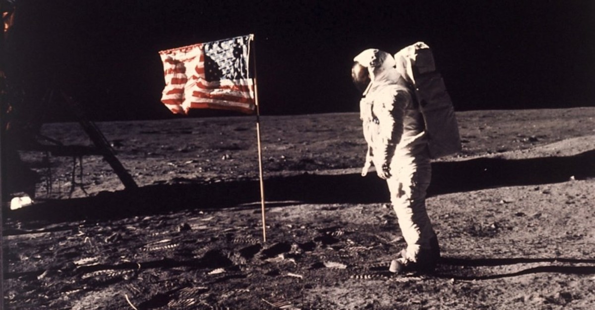 The famous photo of Neil Armstrong landing on the moon and erecting the American flag.