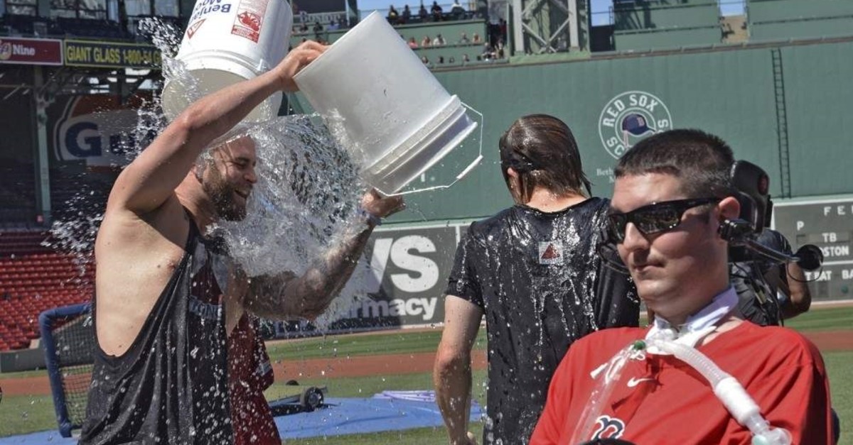 Boston Red Sox player Mike Napoli takes part in the re-launch of the Ice Bucket Challenge as former Boston College baseball player Pete Frates, right, looks on at Fenway Park in Boston, July 31, 2015. (AP Photo)