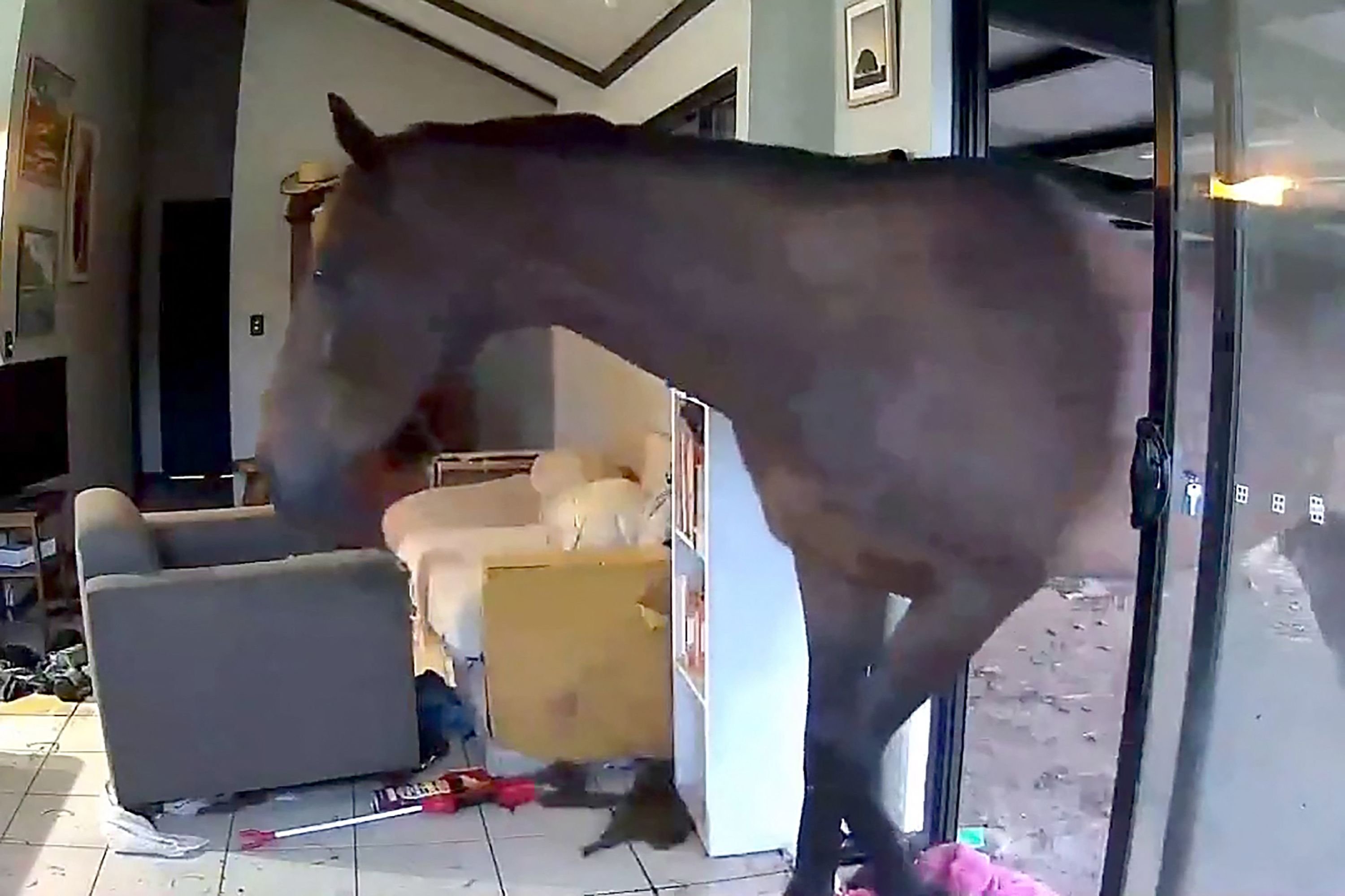 It's followed by a pet horse, "Cricket," which has a good sniff of the couch.