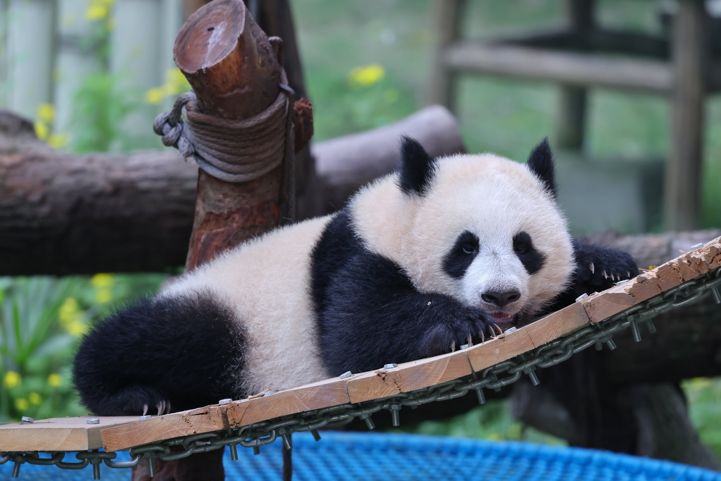 A giant panda named Xiaoyueliang climbs a tree frame in Chongqing Zoo, Chongqing, China, April 19, 2026. (Getty Images Photo)