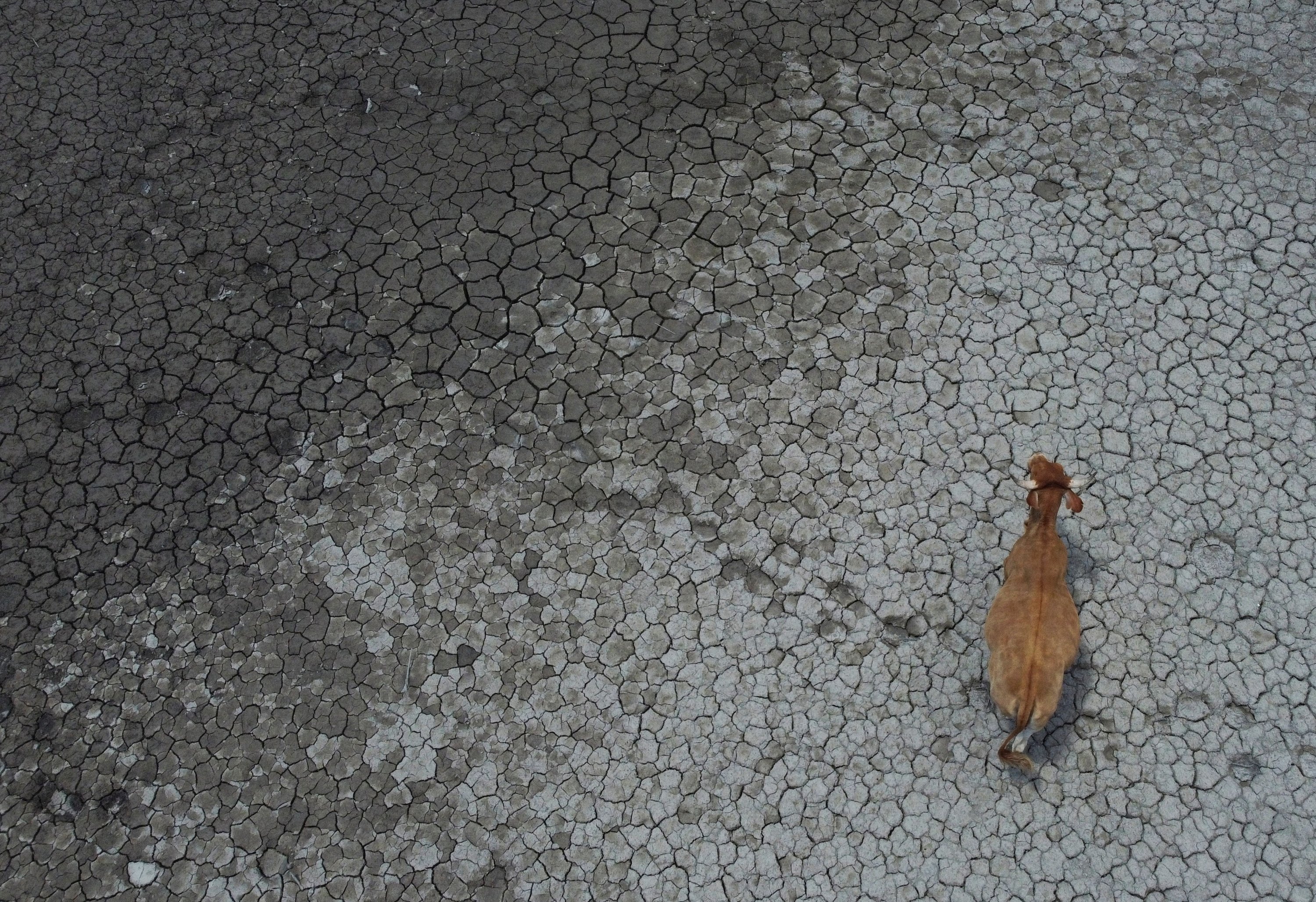 A drone shows a cow walking across the almost empty Del Cerro Prieto dam after a drought that affected northern Mexico, Cerro Prieto, Nuevo  Leon state, Mexico, June 17, 2024. (Reuters Photo)