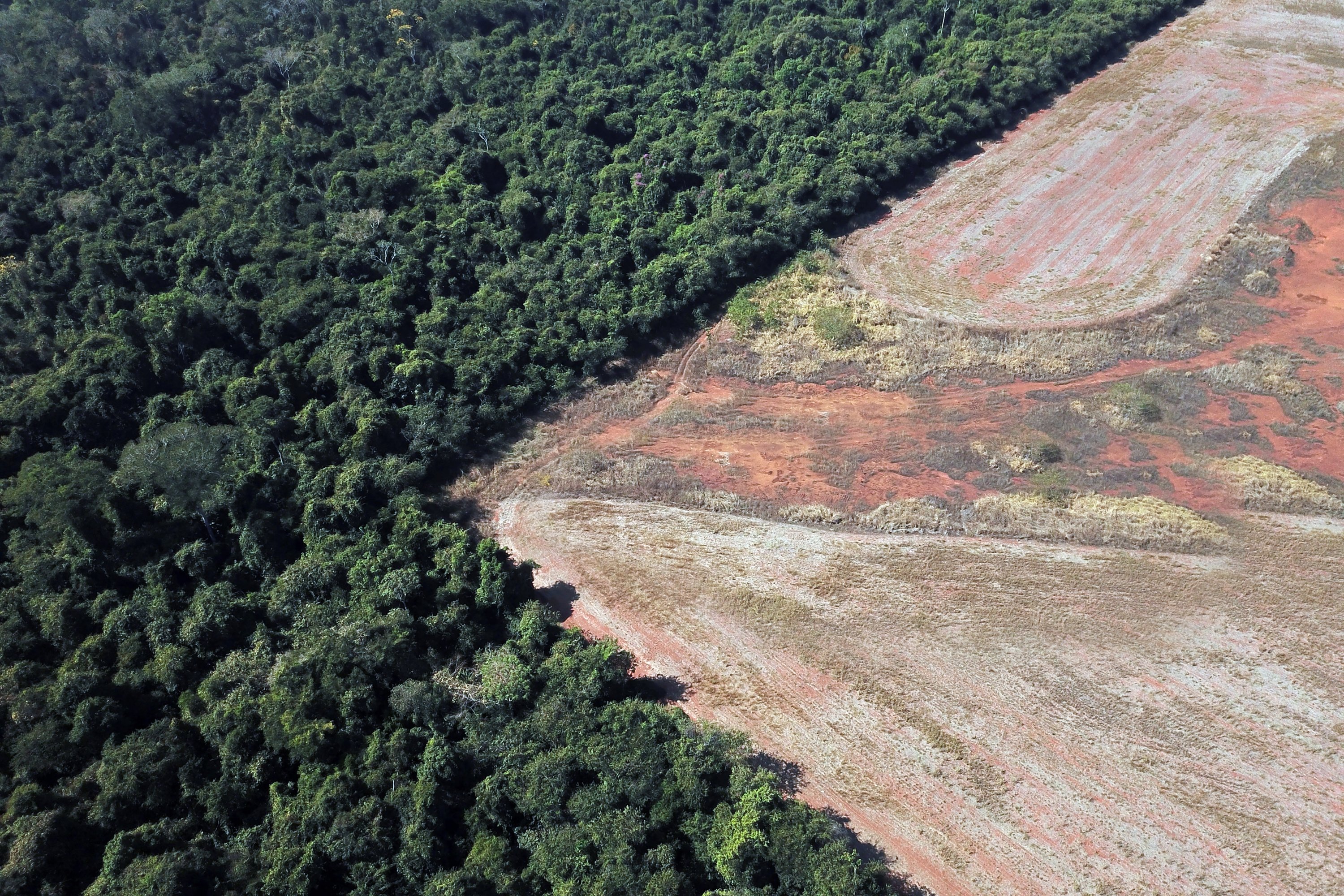 An aerial view of lush green rainforest meeting stark brown deforested land shows the environmental impact of deforestation. (Shutterstock Photo)