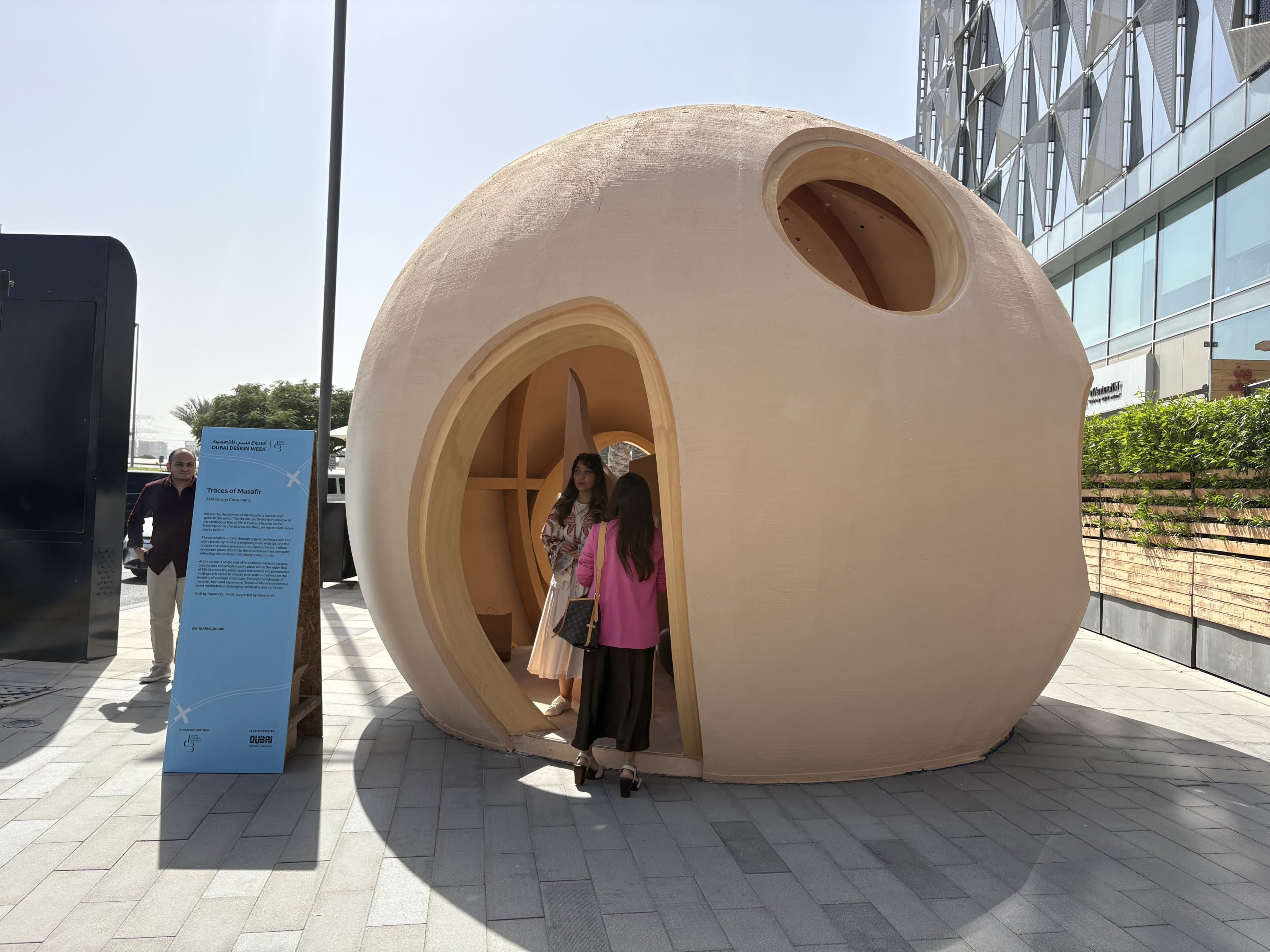 In addition to the eye-catching installations that filled Dubai Design Week, one piece stood out for its quiet poetry, “Traces of Musafir” by ANA Design Consultants, founded by Aslı Naz Atasoy. A circular pavilion of sand paths that appear and disappear underfoot, it captures the fleeting journey of the traveler, the musafir.