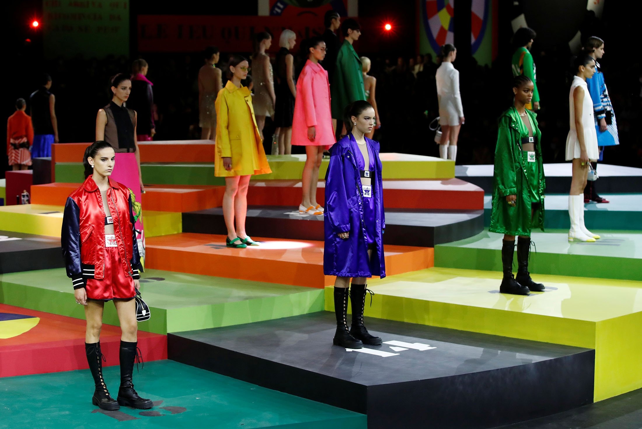 Models in bouncing pony-tails circled round a runway set resembling a board game, decorated with artwork from Rome-based artist Anna Paparatti that broadcast messages infused with irony, like "The game of nonsense."