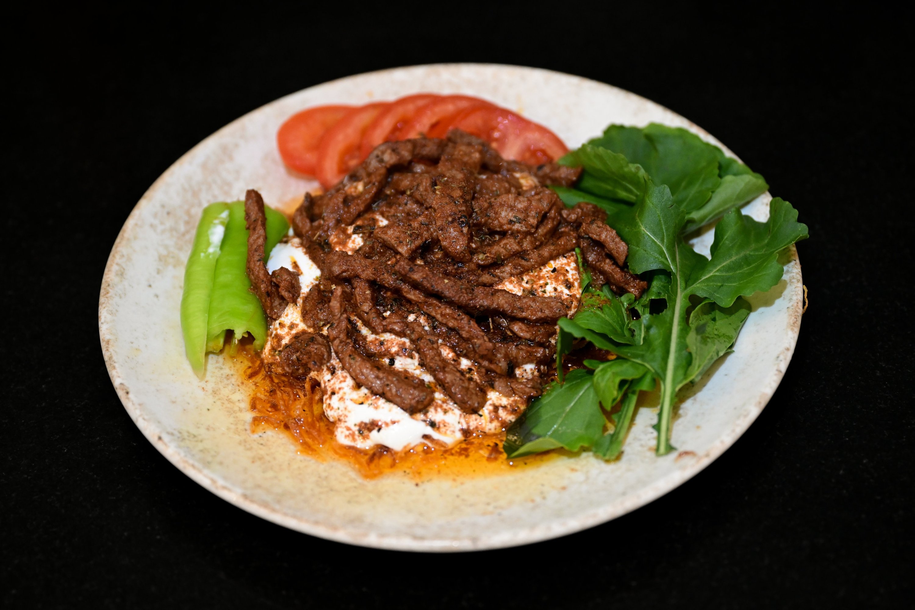 Slices of meat for çökertme kebab are being placed atop garlic-infused yogurt, Muğla, southwestern Türkiye, Jan. 8, 2026. (AA Photo)