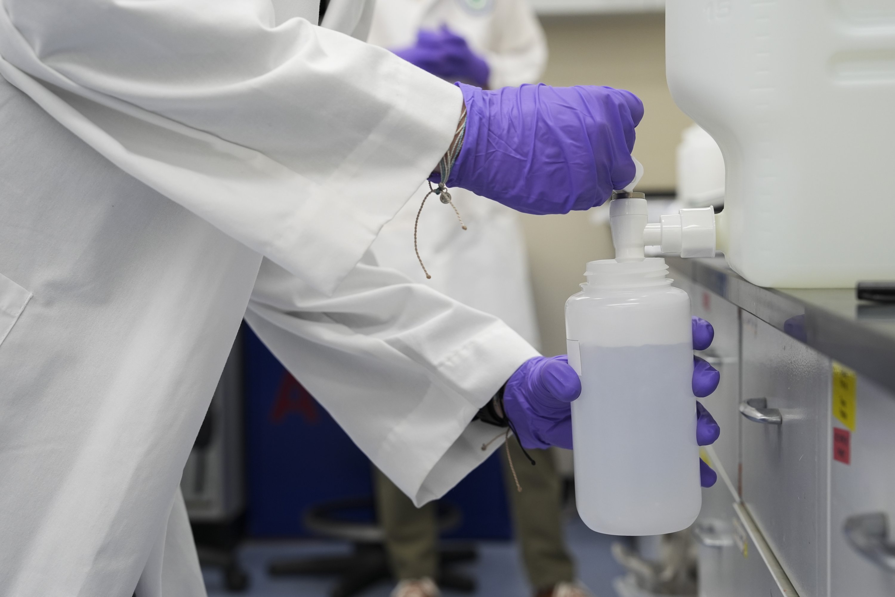 Logan Feeney pours a PFAS water sample into a container for research at a U.S. Environmental Protection Agency lab in Cincinnati, Wednesday, April 10, 2024. (AP File Photo)