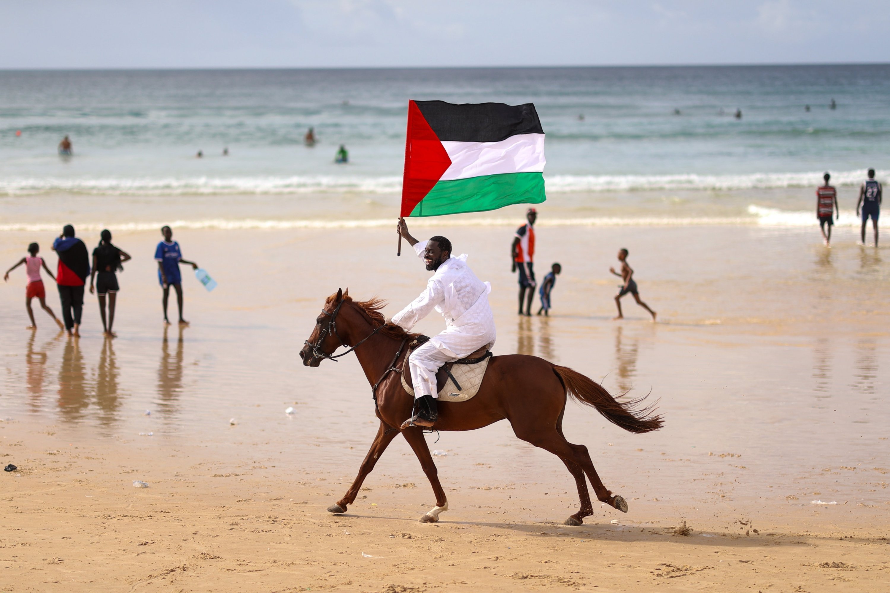Carrying a Palestinian flag as a symbol of solidarity, Gueye then mounted his horse and rode along the coastline, attracting the attention of beachgoers.