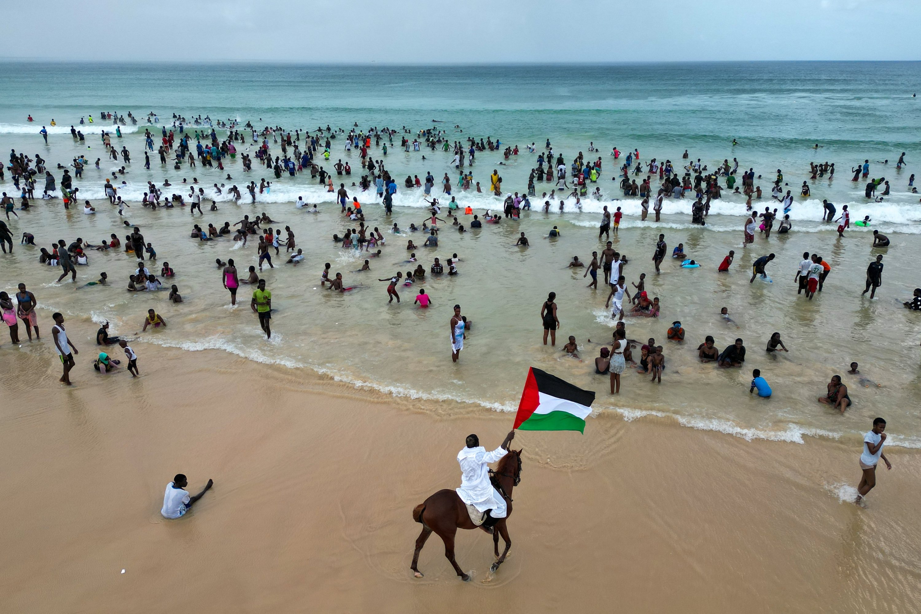 In Dakar, the capital of Senegal, performance artist Thierno Gueye staged a powerful demonstration on horseback along the beach to show solidarity with the people of Gaza.