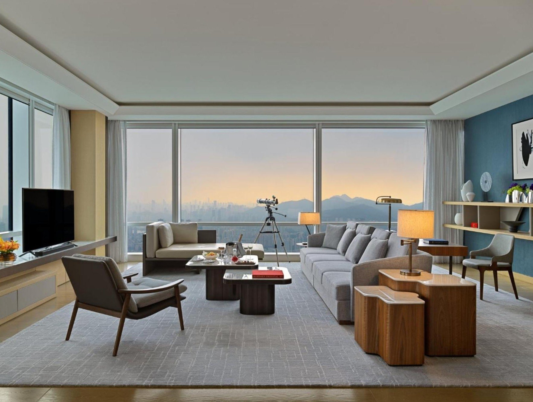 Perched atop the 79-floor UpperHills skyscraper in the heart of Futian, Mandarin Oriental Shenzhen, opened in January 2022 and immediately raised the bar for luxury hospitality in the city. The experience sets the tone from the moment you step into the minimalist lobby, where sculptural furniture and stone gardens blend urban sophistication with natural serenity.