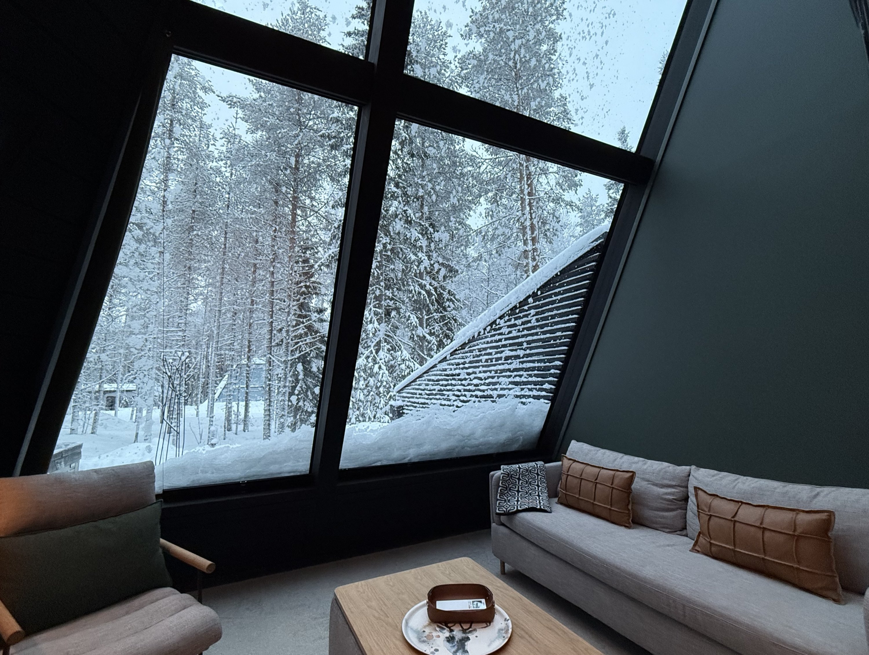From the comfort of your bed, framed by floor-to-ceiling windows, it is possible to witness breathtaking views of snow falling softly through the forest and, on clear nights, the mesmerizing dance of the northern lights.