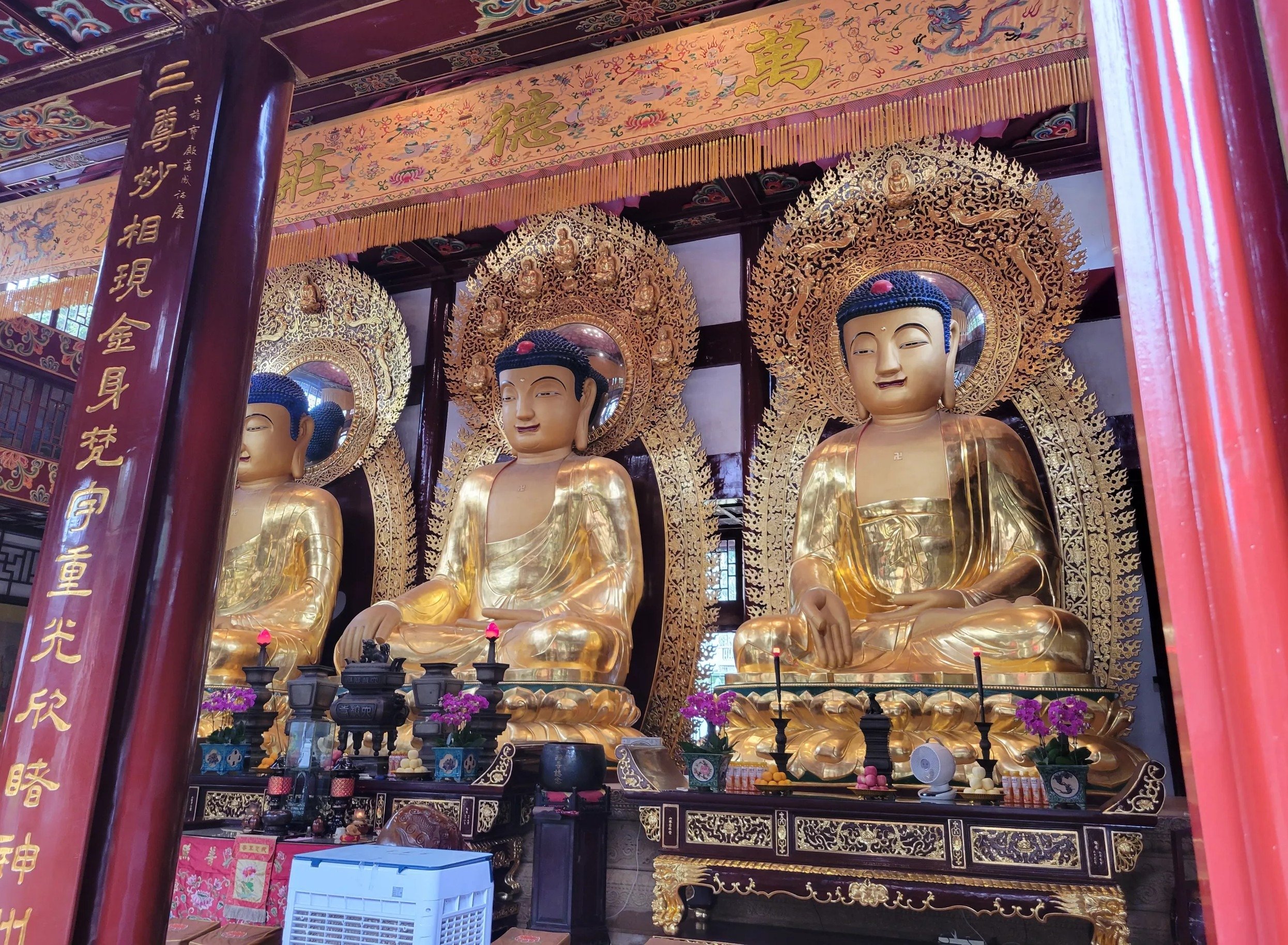 To the east of the pagoda lie the Shanmen Gate, Maitreya Hall, Hall of the Heavenly Kings and Wei Tuo Hall. On the west side rises the majestic Daxiong Baodian, housing three large brass Buddha statues from the Qing dynasty, each with a serene expression.