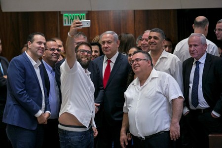The caricature mocks a photo of Netanyahu with a group of Israeli lawmakers taken during celebrations of controversial nation-state law's approval on July 19 in the Knesset by depicting them as pigs with a well-known quote from the book, "All animals are equal but some are more equal than others."