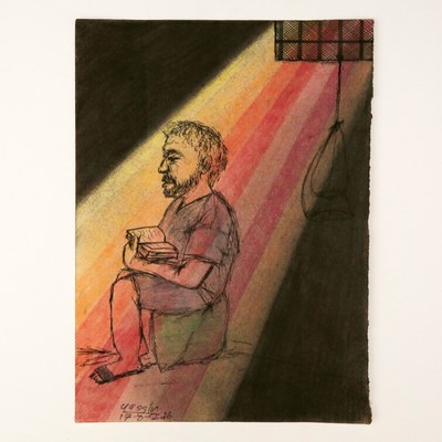 A self-portrait inspired by that experience shows him sitting in the corner of a gray and black cell, slumped in resignation as a solitary ray of sunlight shines through the barred window.