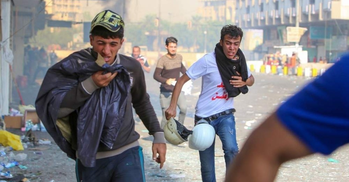 Iraqi protesters run for cover from tear gas fired by security forces in al-Khalani square, Baghdad, Nov. 10, 2019. (AFP Photo)