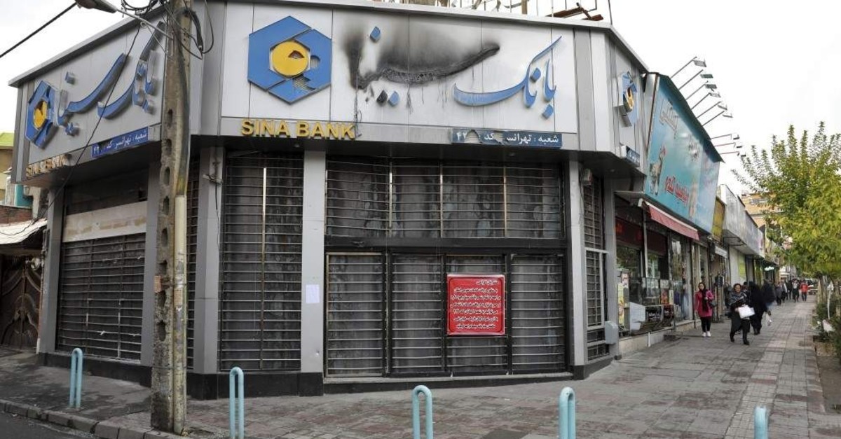 A bank that was attacked and burned during protests remains closed, Tehran, Nov. 20, 2019. (AP Photo)