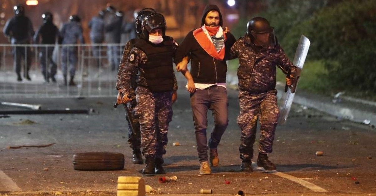 The trouble started Saturday when dozens of men, some wearing masks, threw stones and firecrackers at security forces on one edge of the protest camp in central Beirut. They reportedly were supporters of the Shiite Hezbollah and Amal groups, angered by some of the criticism of their leaders by the protesters.