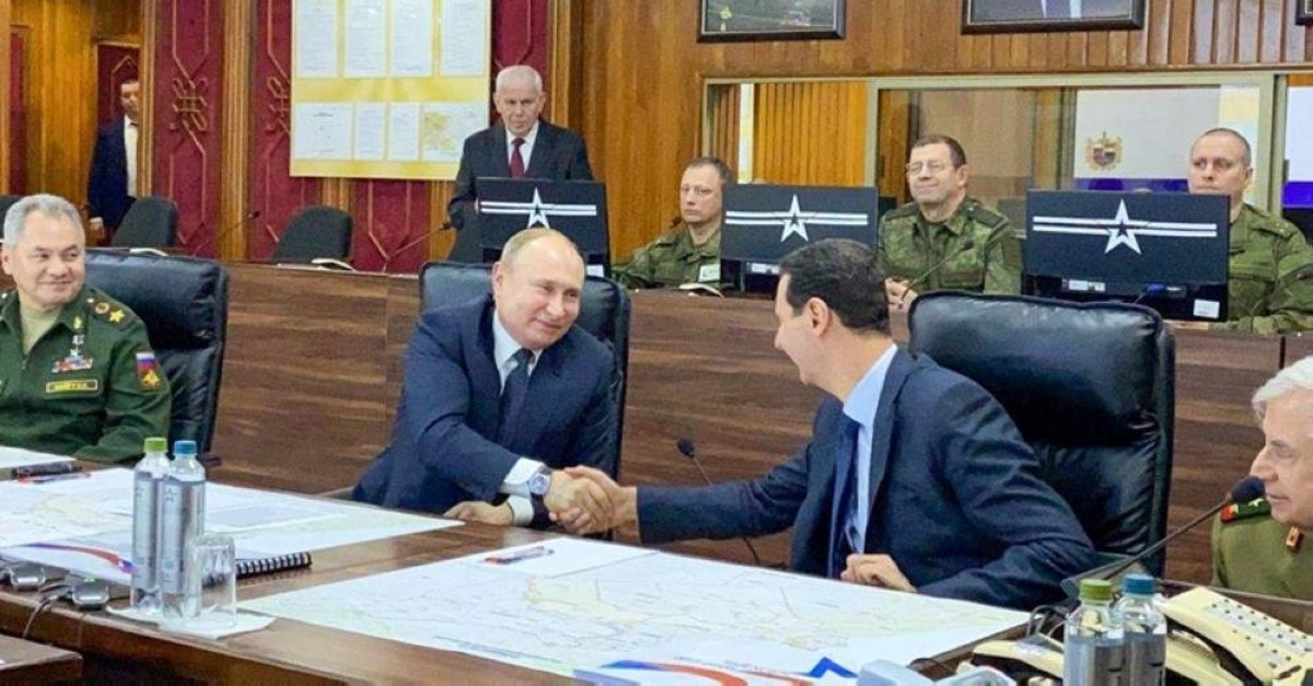 A handout picture released by the official Syrian presidency Telegram page on January 7, 2020 shows Assad (C-R) shaking the hand of Putin (C-L) at the headquarters of the Russian forces in Damascus. (AFP Photo)