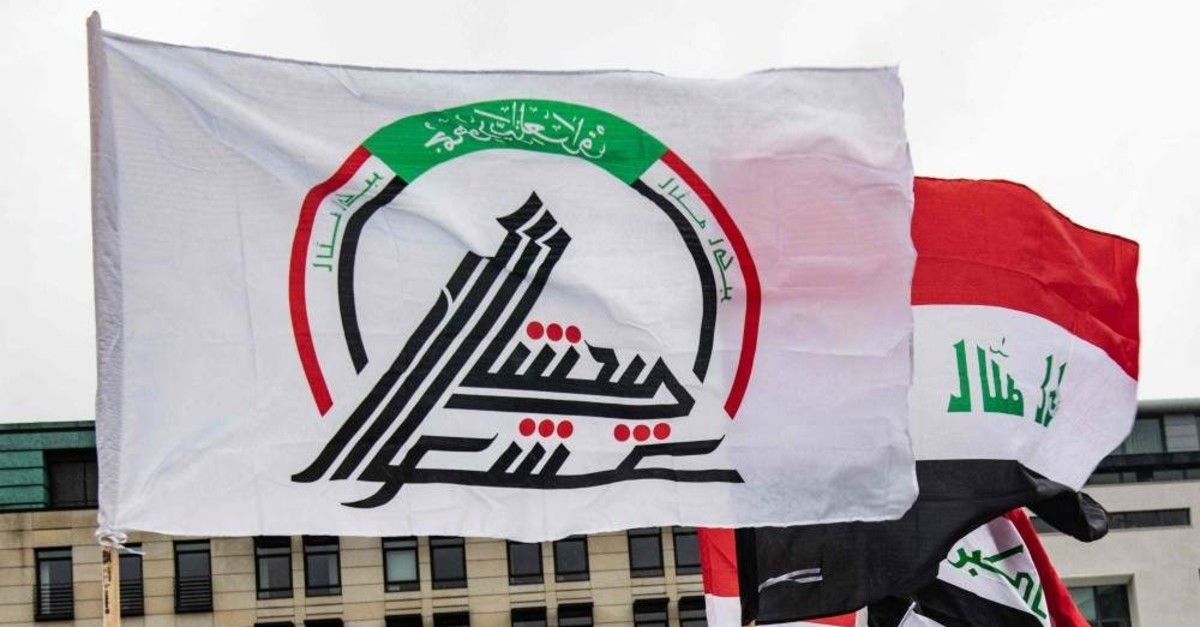 Protesters wave a flag with the insignia of the Popular Mobilization Forces (PMF) during a demonstration in front of the U.S. Embassy in Berlin, Jan. 4, 2020. (AFP Photo)