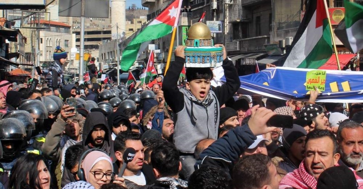 Despite the heavy rain, thousands of Jordanians responded to the calls by the Jordanian parties, rallied for Palestine and chanted slogans calling for the protection of Jerusalem's al-Aqsa Mosque and burned the Israeli flag.